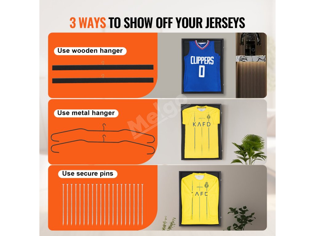 Táto vitrína na dresy je ideálna na prezentáciu rôznych športových dresov vrátane futbalových, basketbalových, futbalových, bejzbalových atď. Je ideálny aj na vystavenie iných typov memorabílií a zberateľských predmetov, ako sú podpísané fotografie, maturitné vysvedčenia, pamätné medaily a ďalšie.