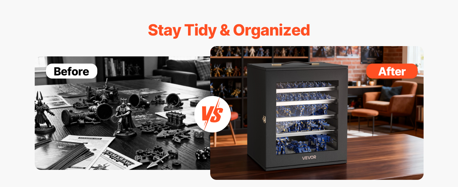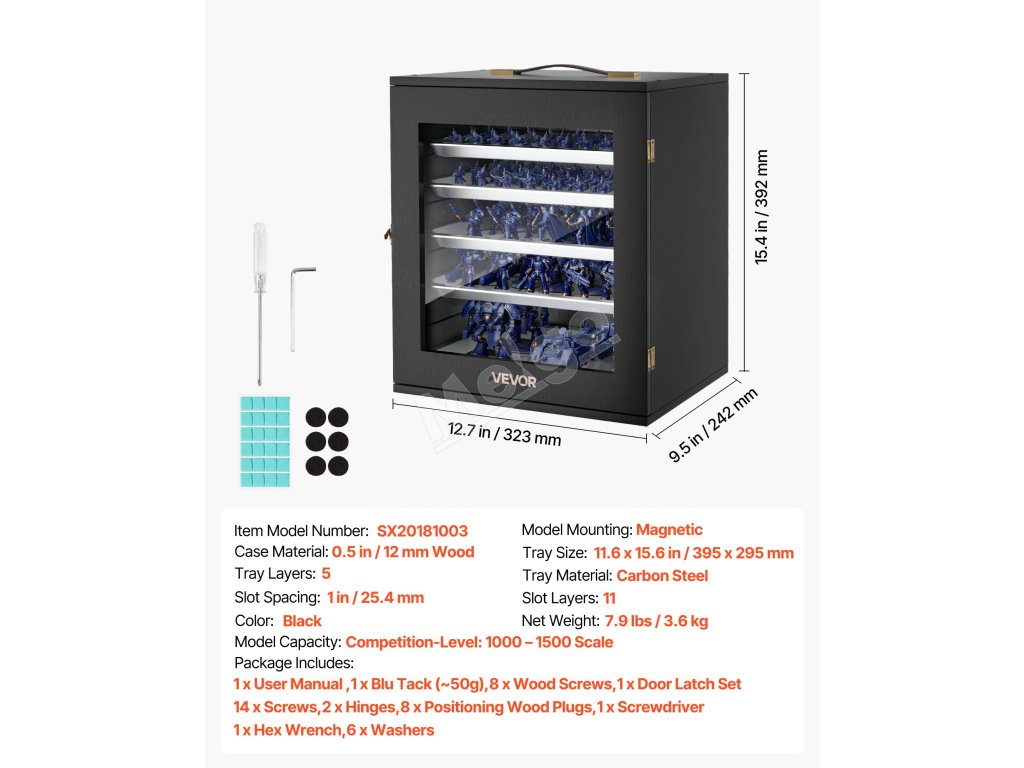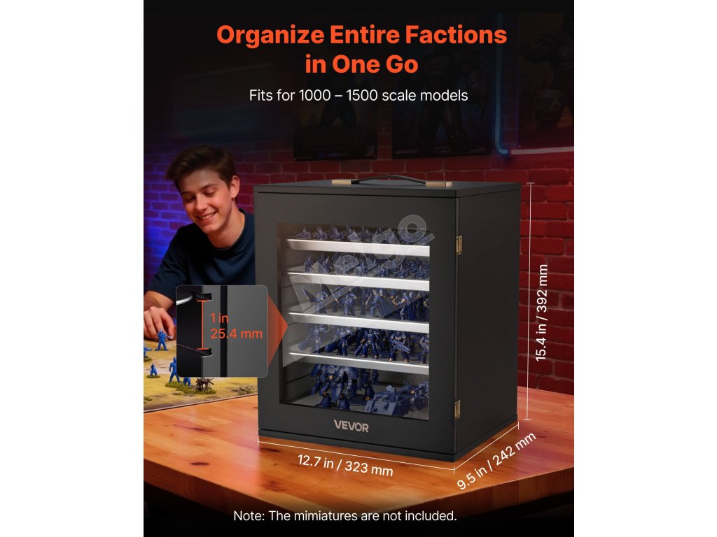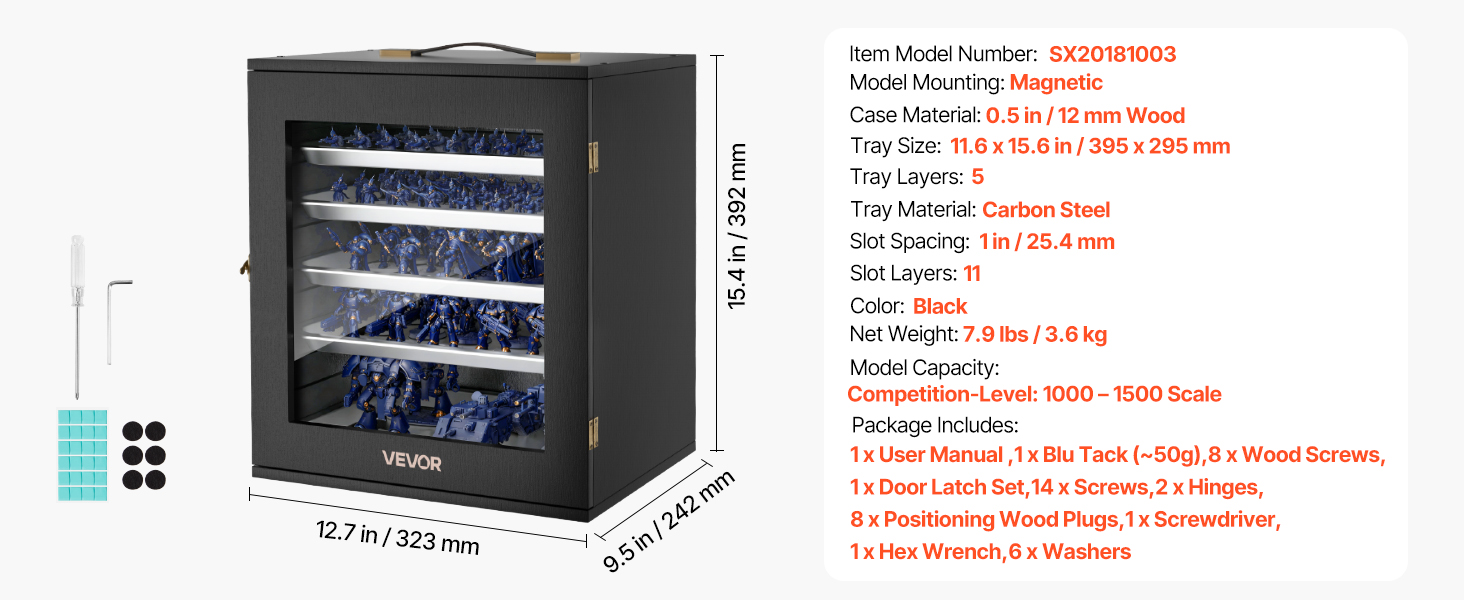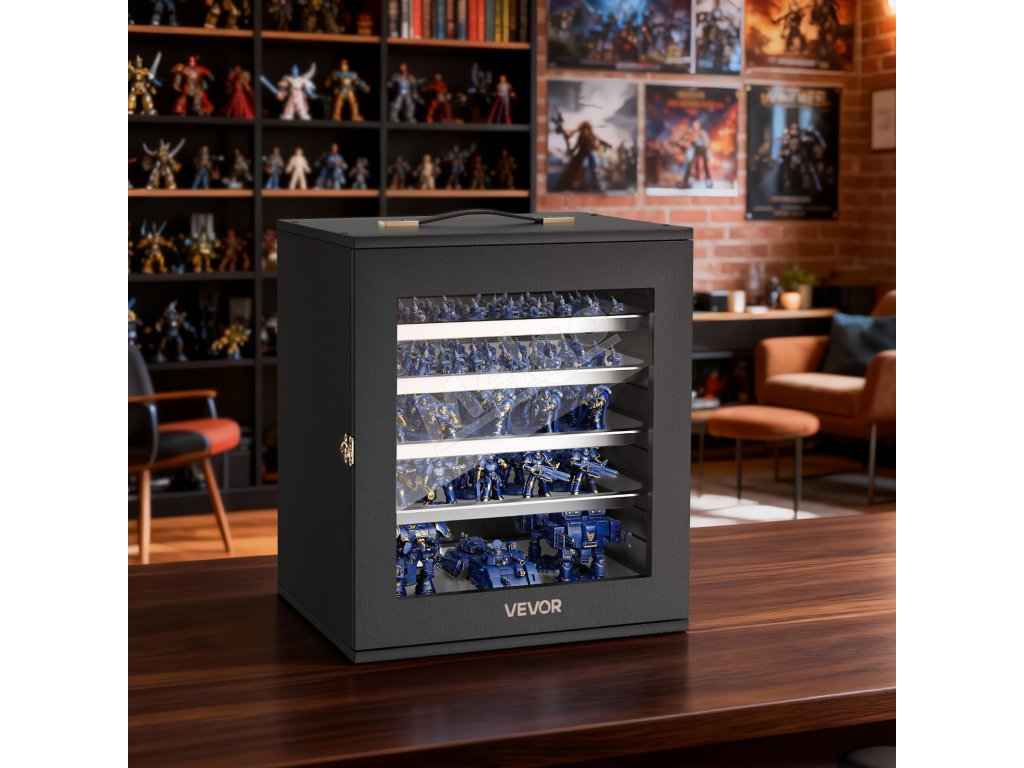Toto puzdro na miniatúry je určené pre zberateľov, ktorí sú často na cestách. Odolné drevené telo odoláva nárazom a stlačeniu, zatiaľ čo päť nastaviteľných magnetických podnosov z uhlíkovej ocele udržuje modely v bezpečí, usporiadané a priestranné – ideálne na cesty, konvencie alebo každodenné skladovanie.