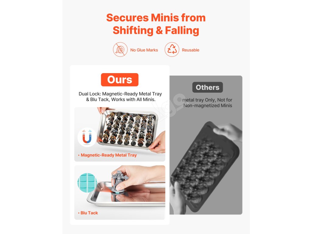 Toto puzdro na prepravu miniatúr vám umožňuje rýchlo vysunúť magnetické podnosy z uhlíkovej ocele. Spárujte ich s opakovane použiteľnou plastelínou na plagáty, aby sa počas prepravy neposúvali – dvojnásobná istota pre maľované miniatúry.