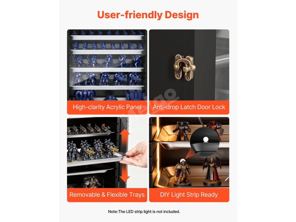 Tento miniatúrny prepravný kufrík má pohodlnú protišmykovú rukoväť, priehľadný akrylový predný diel pre rýchlu kontrolu a západku, ktorá zabraňuje náhodnému otvoreniu. Predvŕtané otvory s priemerom 1,5 mm umožňujú inštaláciu LED pásikov (LED nie sú súčasťou balenia).