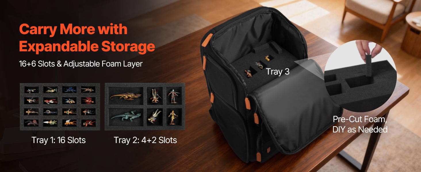 Táto prepravná taška na miniatúry využíva tri vrstvy z perleťovej bavlny: 16-vrstvovú predstrihnutú vrchnú časť, 4+2 pevné stredné časti a spodnú časť s možnosťou zastrihávania. Priestor prispôsobíte rôznym modelom, takže sa rýchlo zmestí do úložného priestoru a vyhľadávanie zostane jednoduché.