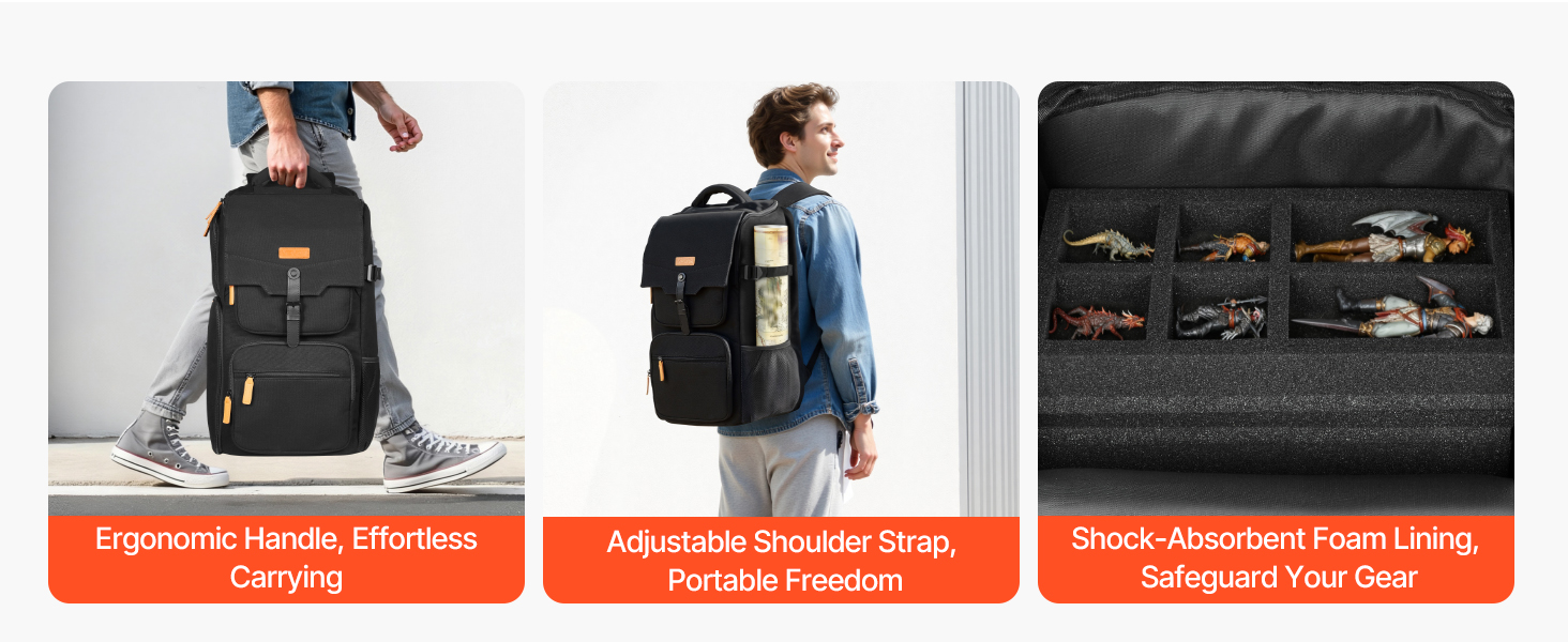 Táto taška na skladovanie miniatúr je určená pre zberateľov. Ľahké polstrovanie z perleťovej bavlny tlmí nárazy a odoláva rozdrveniu, takže modely sú v bezpečí, usporiadané a priestranné. Úložný priestor s viacerými vreckami prenáša herné materiály - skvelé na cestovanie, kongresy alebo každodenné používanie.