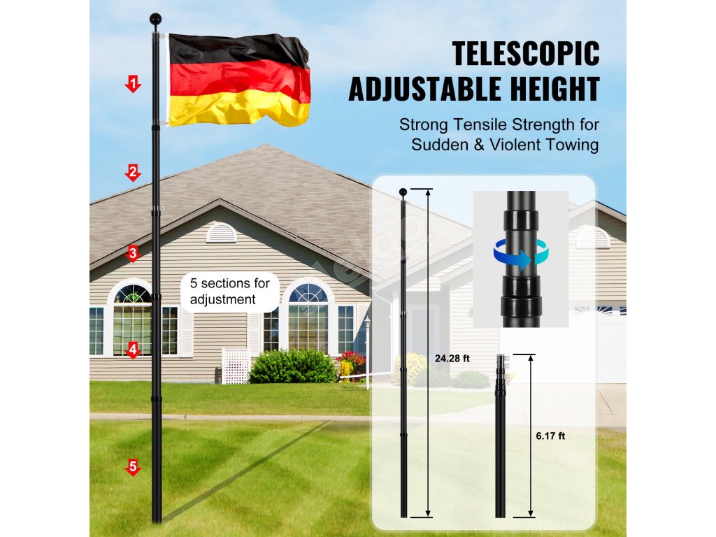 Teleskopický stožiar na vlajky 25 ft, hliníková zliatina, 3 režimy