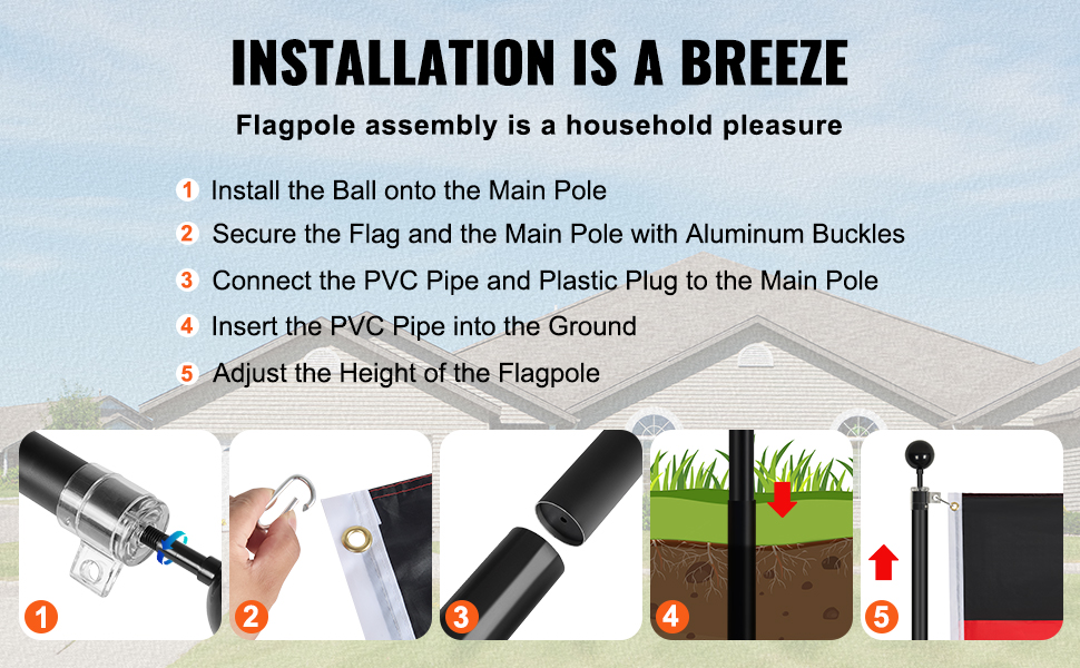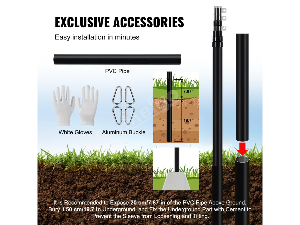 Naša súprava teleskopického stožiara sa dodáva s podrobným návodom na inštaláciu, vďaka čomu je montáž hračka. Od inštalácie zlatej gule na hlavný stožiar až po upevnenie vlajky pomocou hliníkových svoriek a vloženie PVC rúrok do zeme je všetko jednoduché, čo vám umožní užiť si proces DIY.