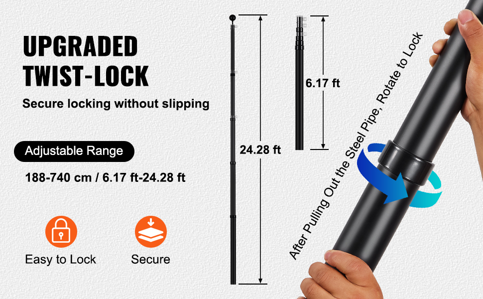 Aby vaša súprava stožiarov na vlajky stála pevne za každého počasia, vylepšili sme ju o konštrukciu so skrutkovým zámkom. Jednoducho vytiahnite oceľovú rúrku a otočením ju bezpečne zaistite na mieste, čím zabránite jej posunutiu. Či už ide o nastavenie výšky stožiara alebo udržanie stabilnej vlajky, naša konštrukcia vyhovie vašim potrebám.