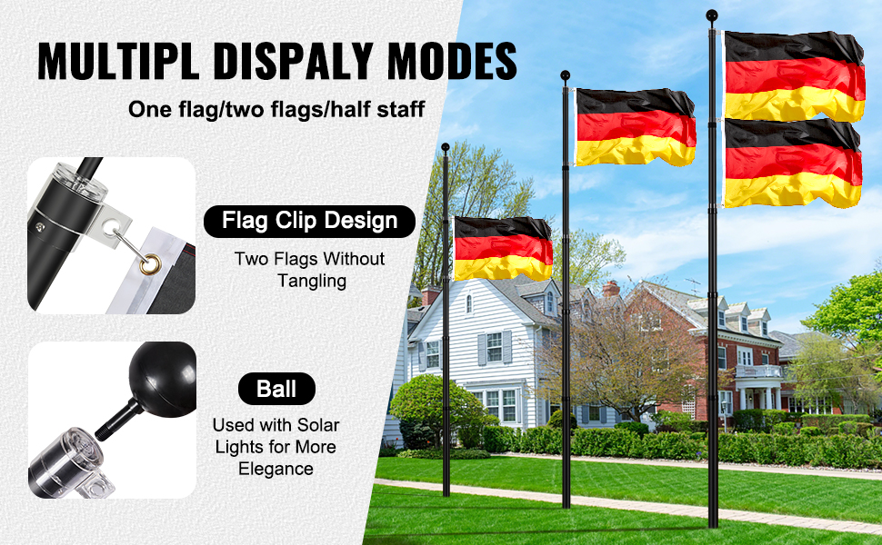 Naša konštrukcia vlajkovej spony stožiara vám umožňuje zavesiť jednu alebo dve vlajky bez obáv z ich zamotania. Vrchná zlatá guľová dekorácia nielenže dodáva estetický vzhľad, ale dopĺňa aj solárne osvetlenie (nie je súčasťou balenia).