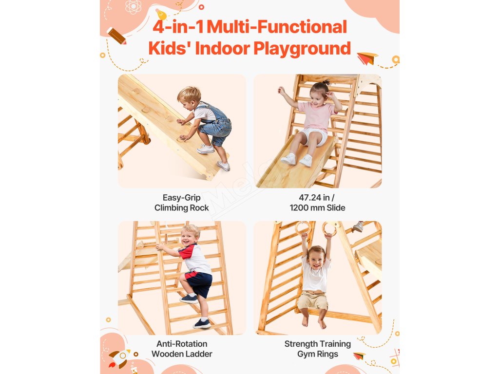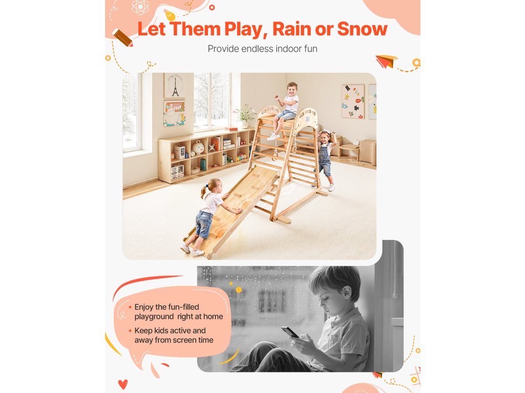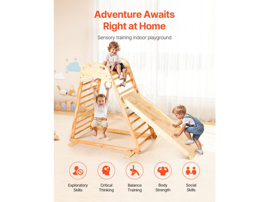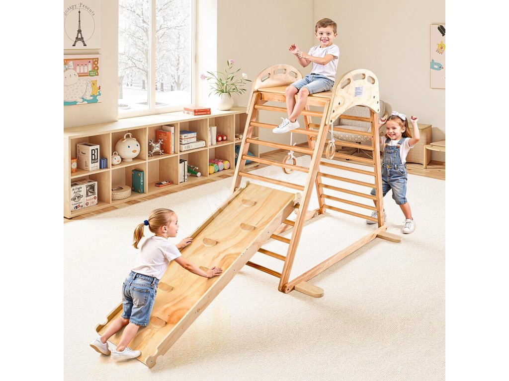 VEVOR 4 v 1 preliezačka na vnútorné ihrisko kombinuje lezeckú skalu, šmýkačku, drevený rebrík a gymnastický kruh. Je vyrobená z materiálov bezpečných pre deti a šetrných k životnému prostrediu, unesie až 220 kg a ponúka nekonečnú zábavu a zároveň zlepšuje rovnováhu a koordináciu detí.