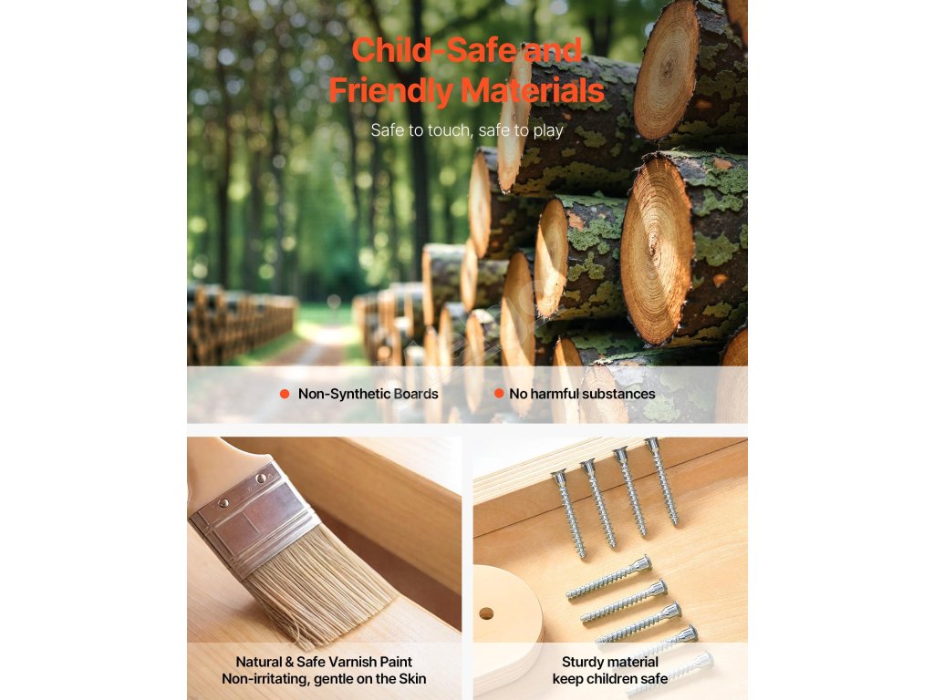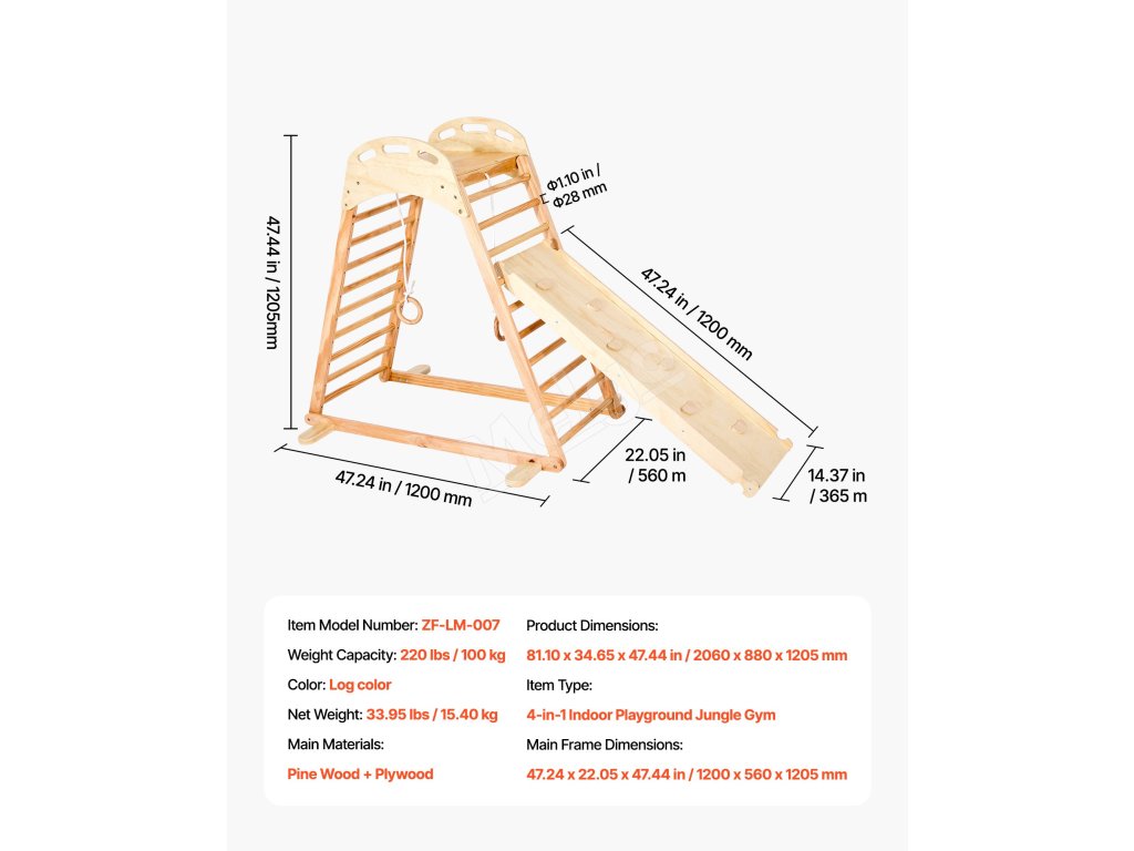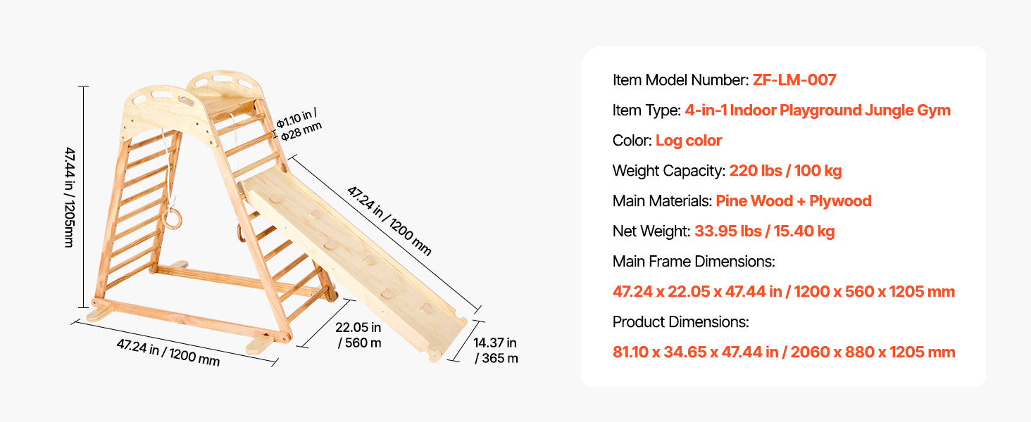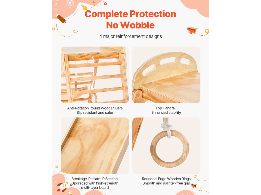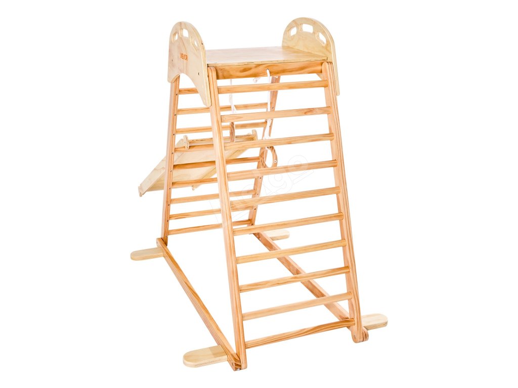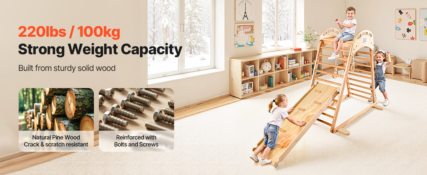 Táto interiérová preliezačka vyrobená z robustného masívneho dreva a vystužená skrutkami a skrutkami unesie až 220 libier (100 kg). Je certifikovaná podľa viacerých medzinárodných noriem, takže poskytuje pokoj rodičom a nekonečnú, bezpečnú zábavu deťom.