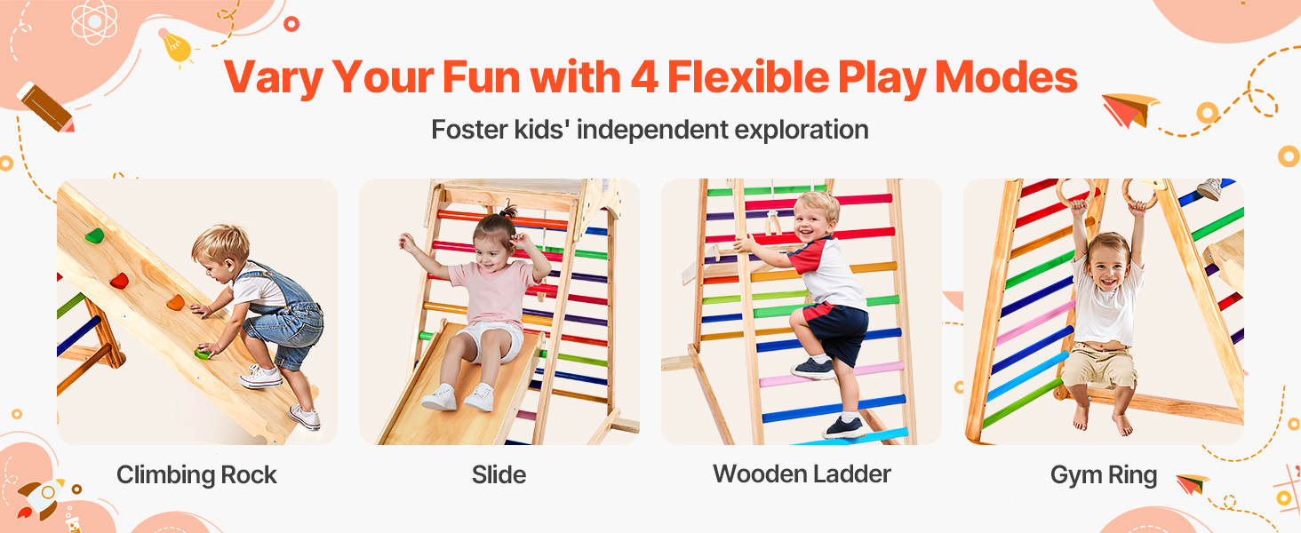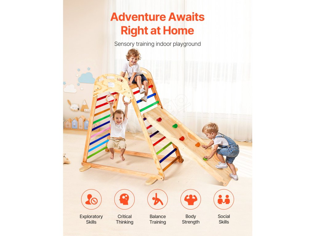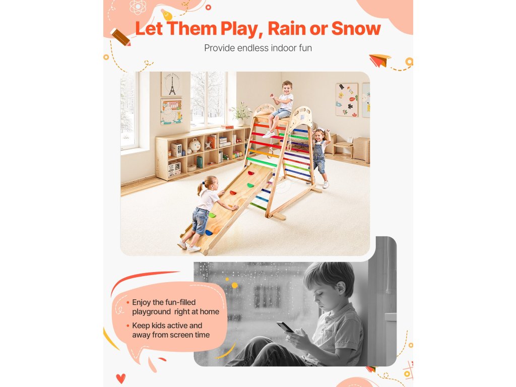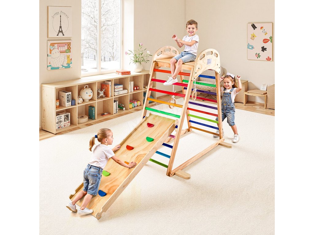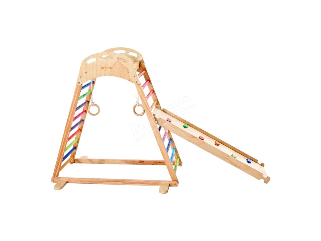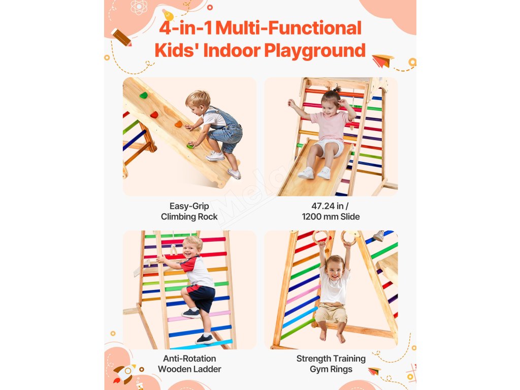 Vnútorné ihrisko VEVOR 4 v 1 kombinuje lezeckú skalu, šmýkačku, drevený rebrík a gymnastické kruhy. Je vyrobená z materiálov bezpečných pre deti a šetrných k životnému prostrediu, unesie až 220 kg a ponúka nekonečnú zábavu a zároveň zlepšuje rovnováhu a koordináciu detí.