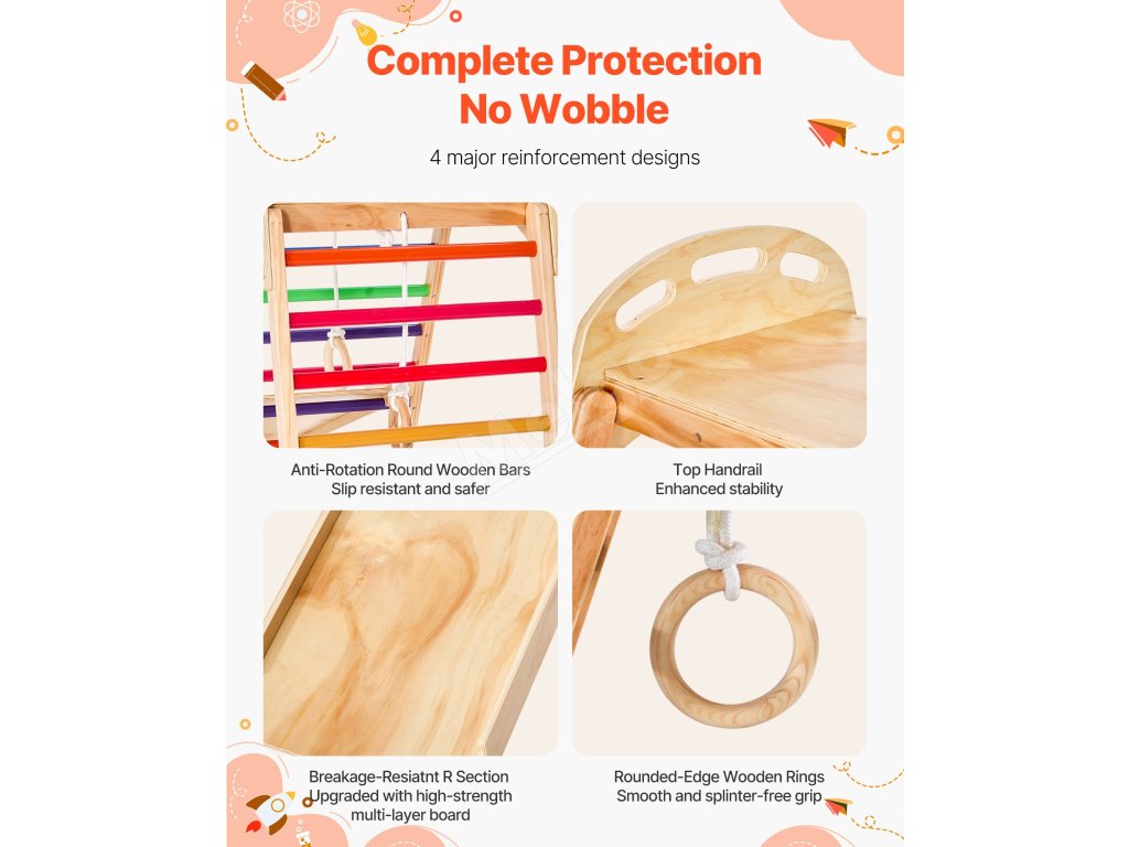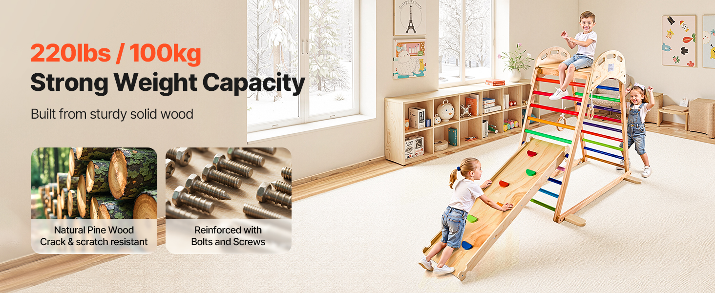 Táto interiérová preliezačka vyrobená z robustného masívneho dreva a vystužená skrutkami a skrutkami unesie až 220 libier (100 kg). Je certifikovaná podľa viacerých medzinárodných noriem, takže poskytuje pokoj rodičom a nekonečnú, bezpečnú zábavu deťom.