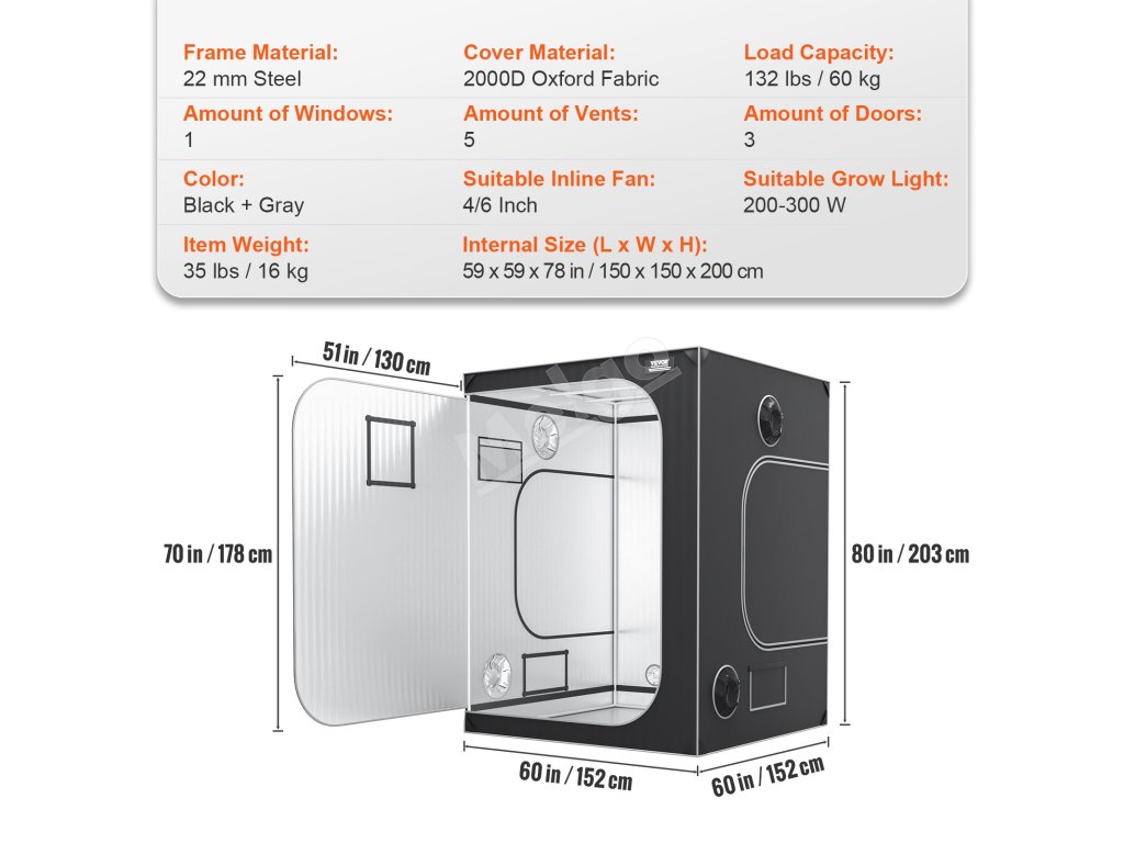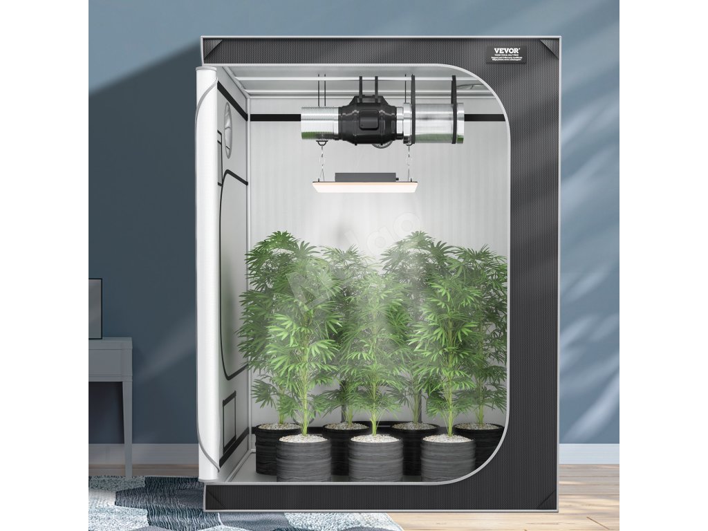 Pestovateľský stan VEVOR 5x5 je vybavený vnútornou časťou z vysoko reflexného materiálu Mylar. Tento materiál zlepšuje distribúciu svetla a zabezpečuje jeho rovnomerné šírenie. Maximalizuje množstvo svetla, ktoré vaše rastliny dostávajú, čím podporuje zdravý rast. Poťah z tkaniny 2000D Oxford je pevný a odolný. Zabraňuje zatekaniu, čím udržiava optimálne prostredie. Stan sme navrhli tak, aby sa prispôsobil rôznym nastaveniam osvetlenia. Unesie až 132 kg zariadenia, vďaka čomu je univerzálny. Tento stan, ideálny na hydroponické pestovanie, zabezpečuje efektívne využívanie svetla. S týmto pokročilým riešením osvetlenia sa vašim rastlinám bude dariť. Robustná konštrukcia zaisťuje stabilitu, vďaka čomu udržiava stabilnú a bezpečnú atmosféru.
