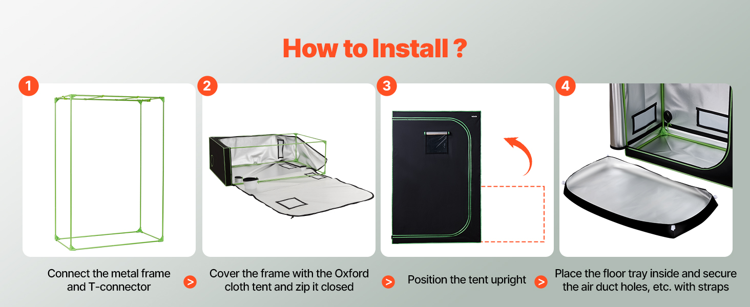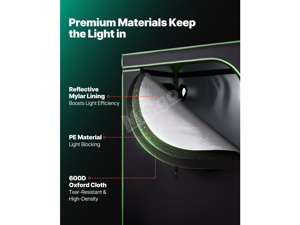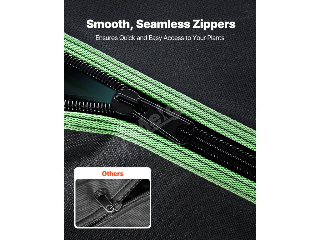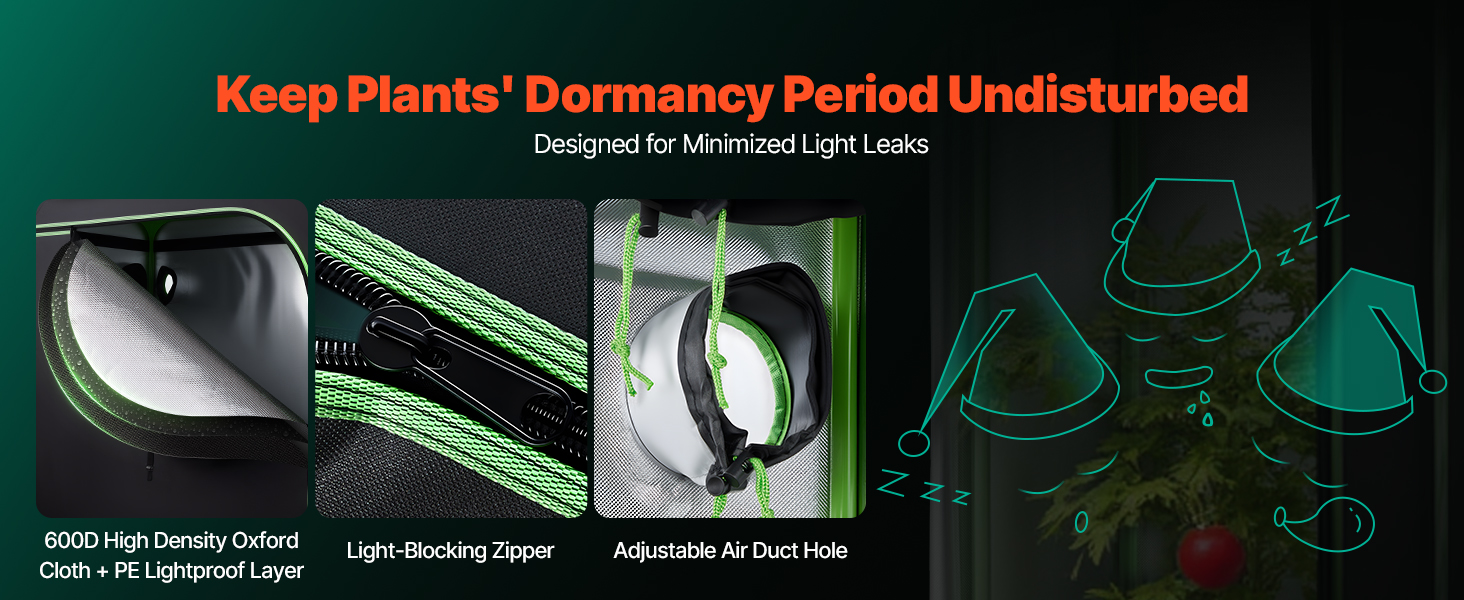 Pestovateľský stan pre izbové rastliny je vybavený zipsami blokujúcimi svetlo a utesnenými vetracími otvormi, ktoré účinne zabraňujú úniku svetla a zabezpečujú vašim rastlinám správny tmavý cyklus pre zdravý rast a pokojový režim. To pomáha zvýšiť celkovú účinnosť pestovania.