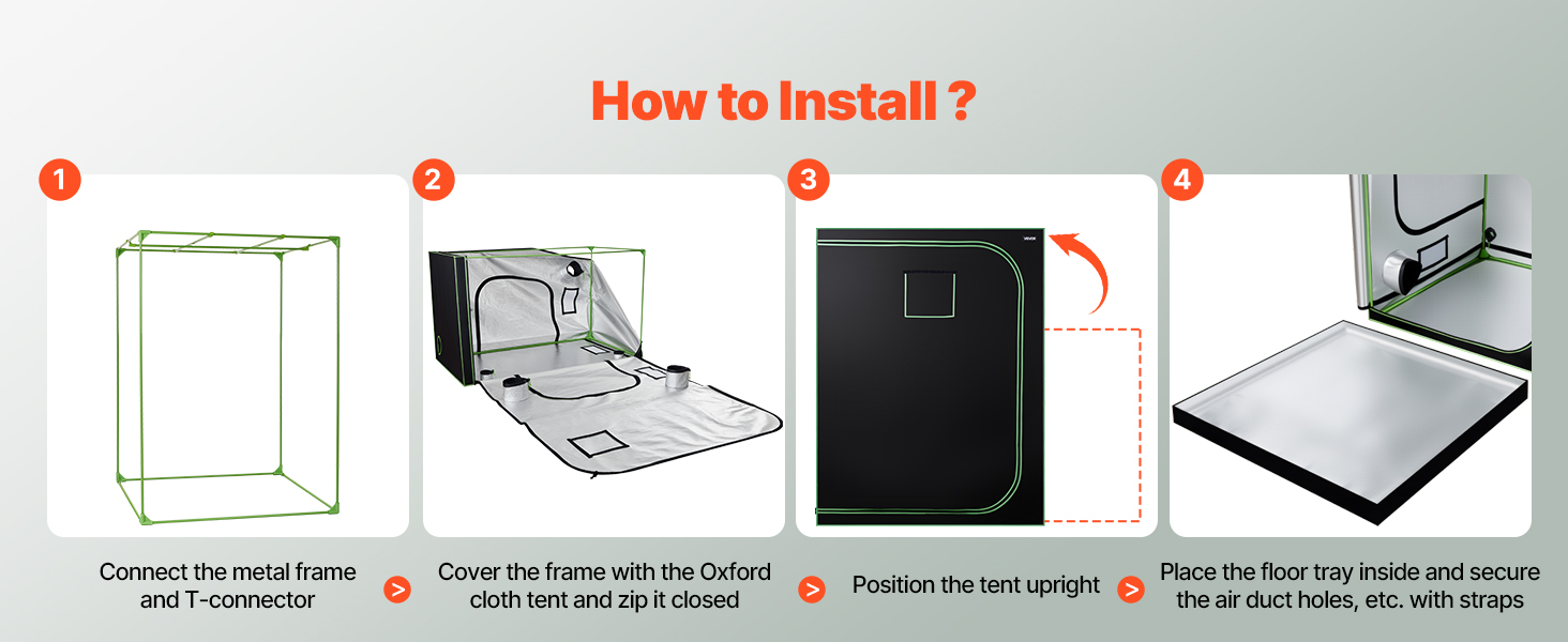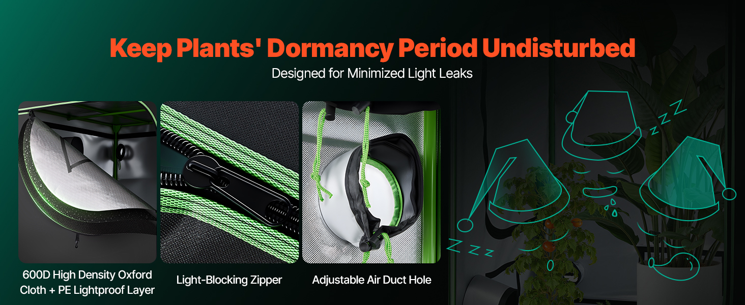 Pestovateľský stan pre izbové rastliny je vybavený zipsami blokujúcimi svetlo a utesnenými vetracími otvormi, ktoré účinne zabraňujú úniku svetla a zabezpečujú vašim rastlinám správny tmavý cyklus pre zdravý rast a pokojový režim. To pomáha zvýšiť celkovú účinnosť pestovania.