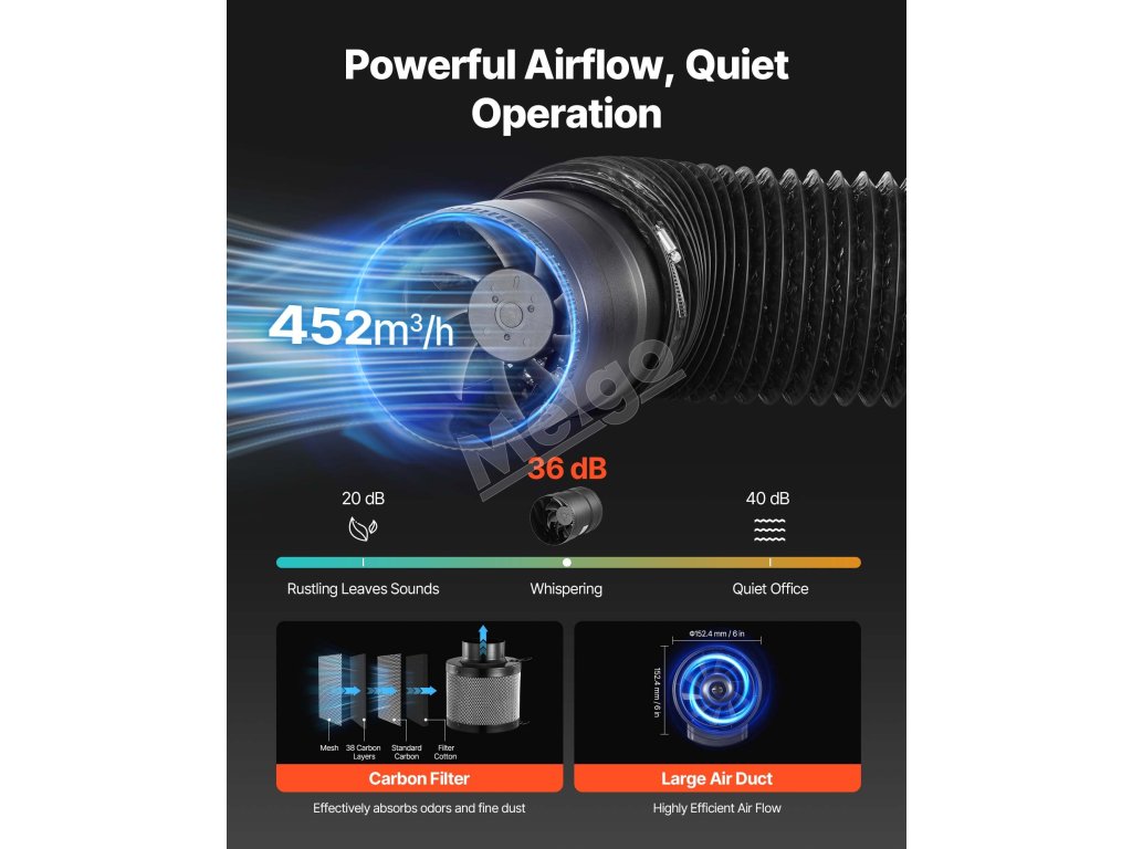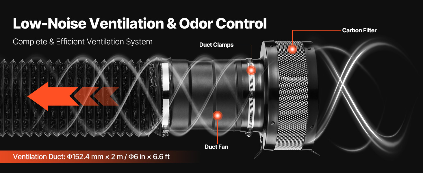 Kompletný systém potrubia účinne dosahuje správne prúdenie vzduchu a rýchle odstraňovanie vlhkosti, ale tiež čistí pachy uvoľňované rastlinami, čím vytvára stabilné a čisté prostredie pre pestovanie. Vďaka nízkej prevádzkovej hlučnosti je vhodný na použitie v domácnosti.