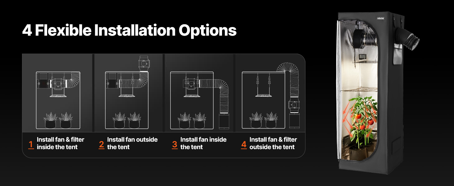 Či už ide o optimalizáciu prúdenia vzduchu alebo úsporu miesta, naše pestovateľské stany pre izbové rastliny podporujú rôzne usporiadania ventilátorov a filtrov, čím ponúkajú flexibilitu na splnenie rôznych požiadaviek na pestovanie rastlín.