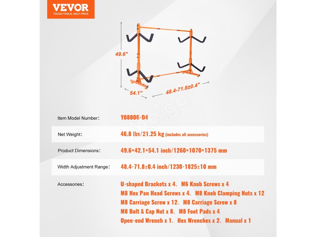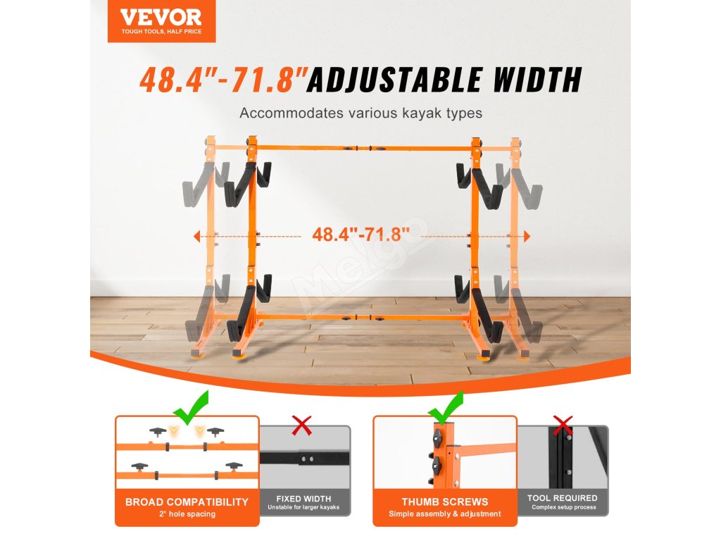 Tento stojan na uskladnenie kajaku umožňuje rýchle nastavenie bez potreby použitia náradia. Jeho šírku možno nastaviť v rozsahu od 48,4" do 71,8" (1230 - 1825 mm), aby sa doň zmestilo široké spektrum vodáckeho vybavenia vrátane kajakov, malých kanoí a paddleboardov.