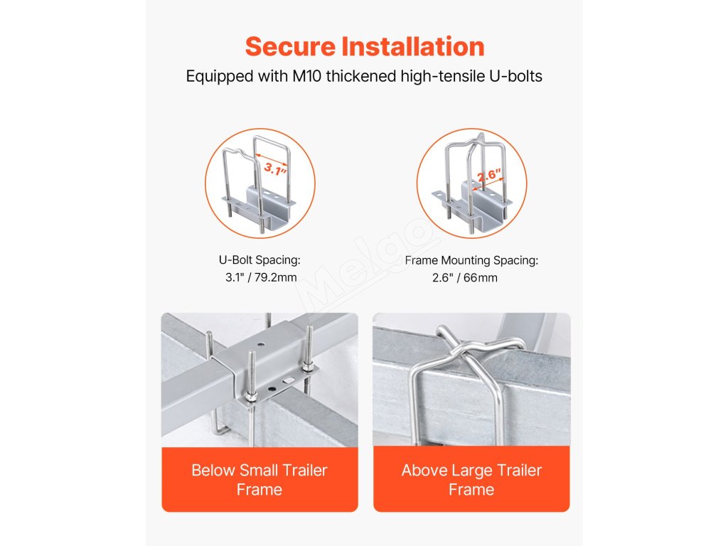 Súprava tyčového vedenia prívesu na čln VEVOR má dve možnosti montáže s nastaviteľnými U-skrutkami, ktoré sa hodia na nosníky prívesov s rôznou šírkou. Táto konštrukcia zabezpečuje bezpečnú a stabilnú inštaláciu, čím sa predchádza uvoľneniu alebo kývaniu vodiacich tyčí počas prepravy.