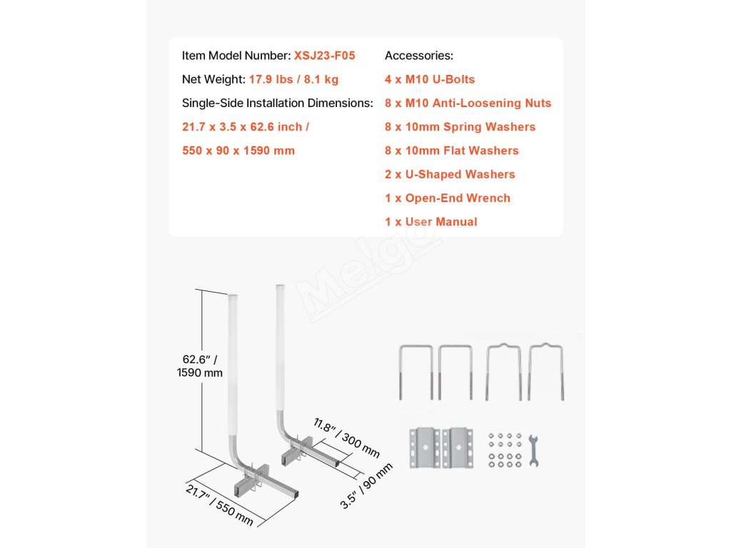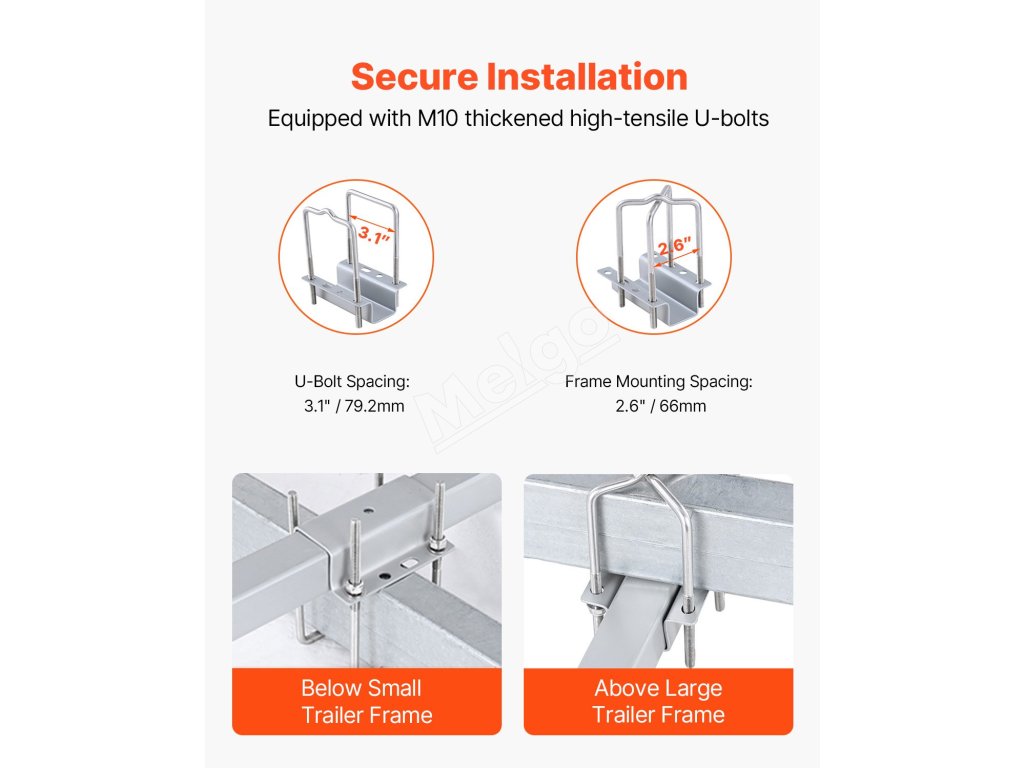 Súprava tyčového vedenia prívesu na čln VEVOR má dve možnosti montáže s nastaviteľnými U-skrutkami, ktoré sa hodia na nosníky prívesov s rôznou šírkou. Táto konštrukcia zabezpečuje bezpečnú a stabilnú inštaláciu, čím sa predchádza uvoľneniu alebo kývaniu vodiacich tyčí počas prepravy.