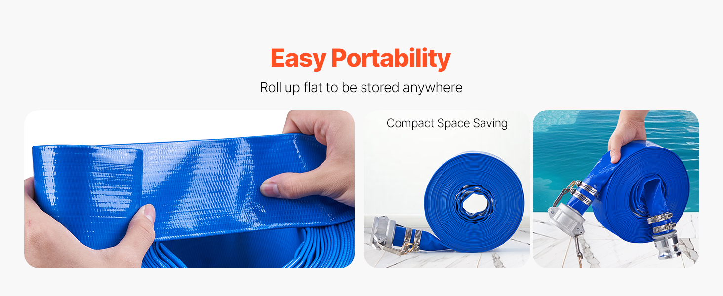 Súpravu hadice na spätné preplachovanie možno ohýbať, skladať a zrolovať na plocho na jednoduché skladovanie a prenášanie.