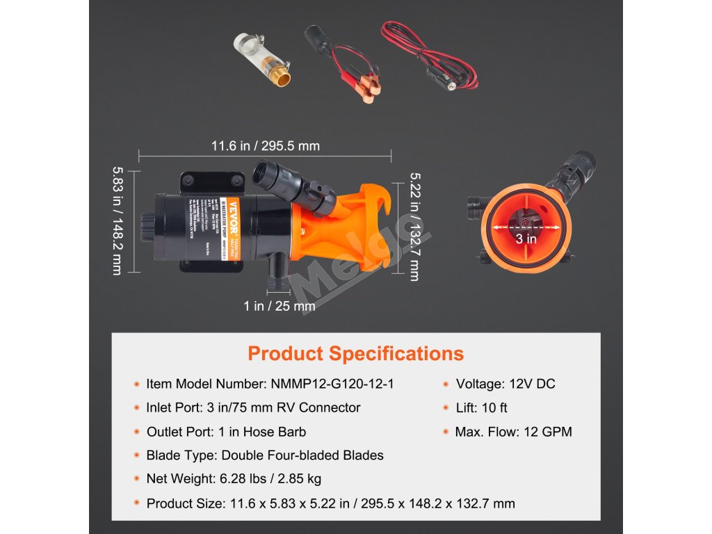 Makerátorové čerpadlo VEVOR RV sa môže pochváliť zdvihom 10 stôp/3 m, ktorý dokáže vyprázdniť 150 l nádrž na čiernu vodu za 5 minút. Vybavené dvojitým štvorlopatkovým obežným kolesom a výkonným motorom bez námahy rozomelie pevné nečistoty na jednoduchú likvidáciu, ideálne na vyprázdňovanie nádrží na čiernu vodu v RV atď.