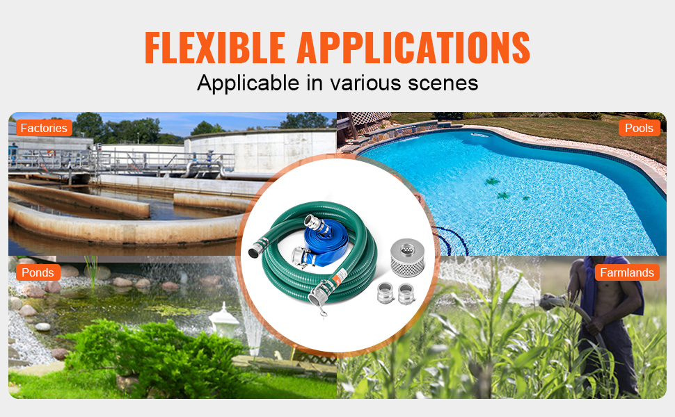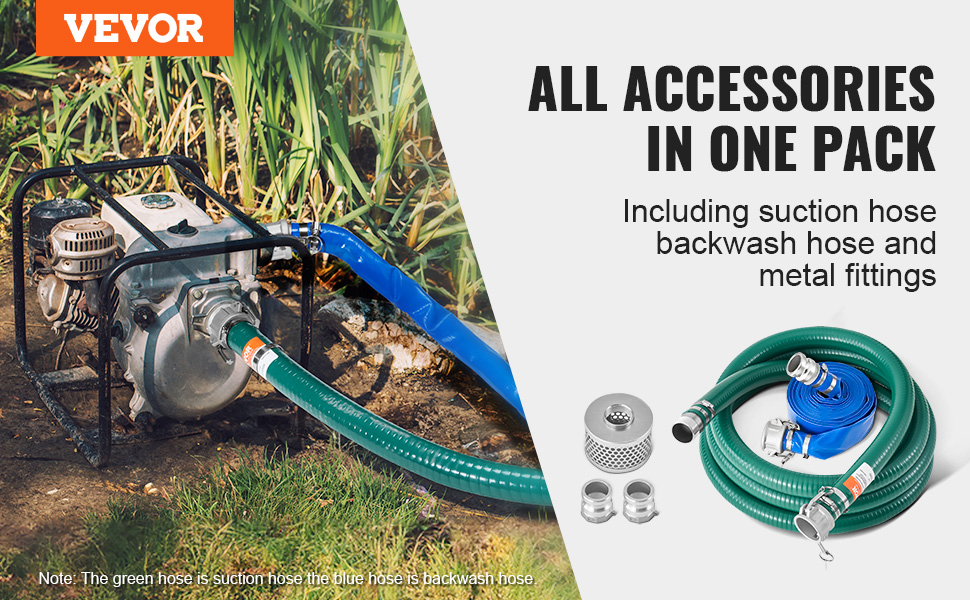 Naša súprava hadíc je nevyhnutná pre motorové čerpadlá a obsahuje 3 časti: pevnú saciu hadicu (zelenú), mäkkú hadicu na spätné preplachovanie (modrú) a príslušenstvo. Naša súprava hadíc, ktorá sa používa na sacie potrubia 2 in x 50 ft, je odolná s jemnou odolnosťou proti korózii/hrdzi a silnými tesniacimi vlastnosťami, dobrá na rôzne čerpadlá v rôznych scénach.