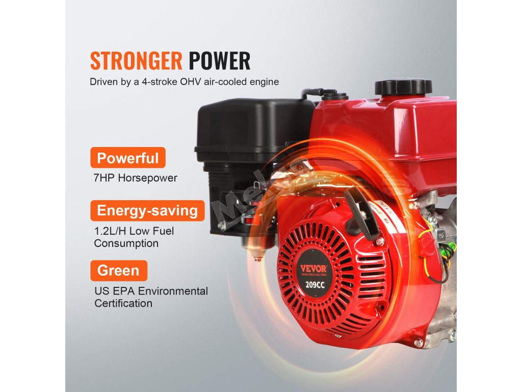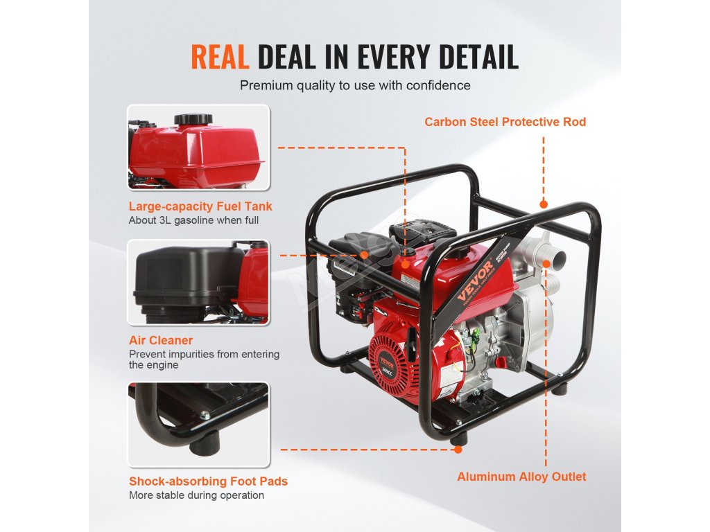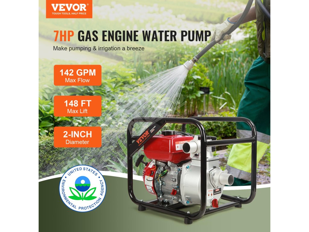 Benzínové vodné čerpadlo VEVOR má silný 4-taktný motor s výkonom 7 koní, ktorý zostáva chladný aj pri náročnej práci. Dokáže premiestniť až 142 galónov vody za minútu a má 2-palcový vstup a výstup. To je skvelé na veľké a ťažké úlohy. Čerpadlo pracuje dobre, pričom zdvihne vodu do výšky 148 stôp. To znamená, že bez problémov dokáže premiestniť vodu na vyššie miesta.