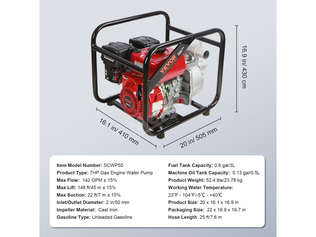 Má tiež sací výkon 22 stôp na vytiahnutie vody z hlbokých miest, vďaka čomu je veľmi užitočné na rôzne práce. Či už ide o zavlažovanie veľkých plôch, vyprázdňovanie bazéna alebo riešenie problému so záplavovou vodou, toto vodné čerpadlo s výkonom 7 HP vám uľahčí a urýchli prácu. Jeho výkonný motor a vysoký prietok z neho robia spoľahlivý nástroj na akúkoľvek úlohu, ktorú potrebujete na čerpanie vody.