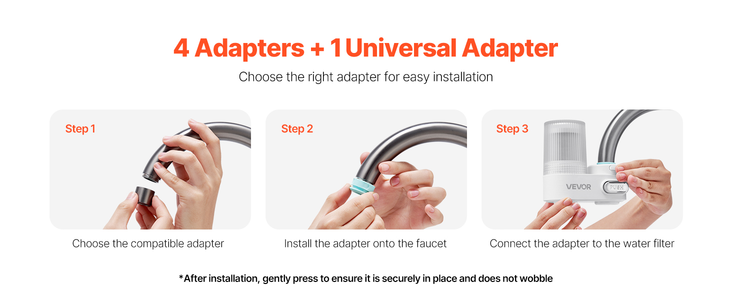 Čistička vody do umývadla obsahuje 4 adaptéry a 1 univerzálny adaptér na jednoduchý výber. Vyberte si správny adaptér a inštaláciu ľahko dokončíte do 5 minút.