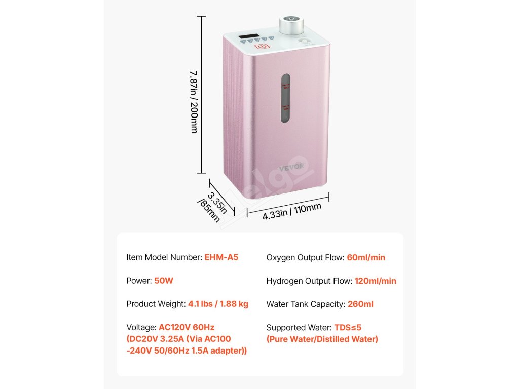 Generátor vodíkového inhalátora váži len 4,1 lbs / 1,88 kg, takže sa ľahko prenáša. Dodáva sa so zabudovanou dobíjateľnou lítiovou batériou, ktorá ponúka pohodlie pri používaní na cestách.