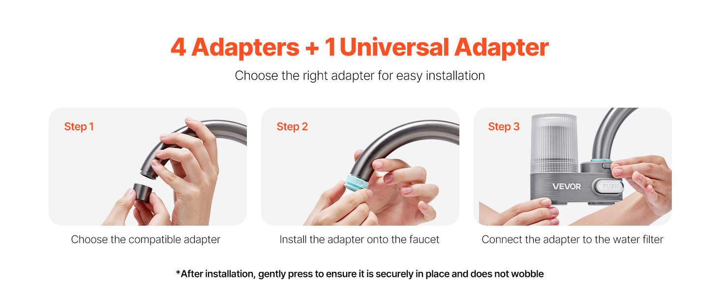 Čistička vody do umývadla obsahuje 4 adaptéry a 1 univerzálny adaptér na jednoduchý výber. Vyberte si správny adaptér a inštaláciu ľahko dokončíte do 5 minút.