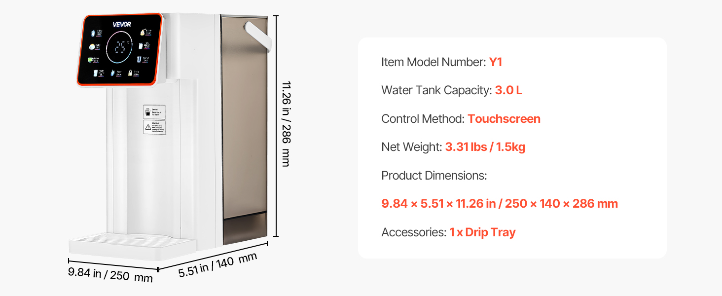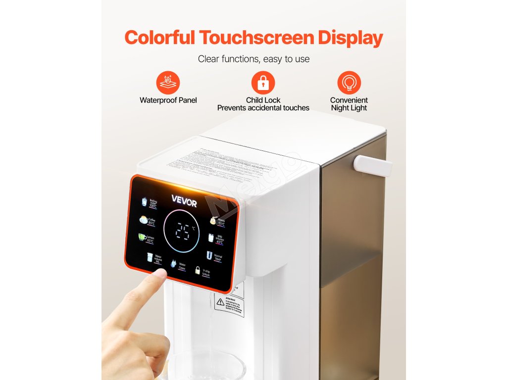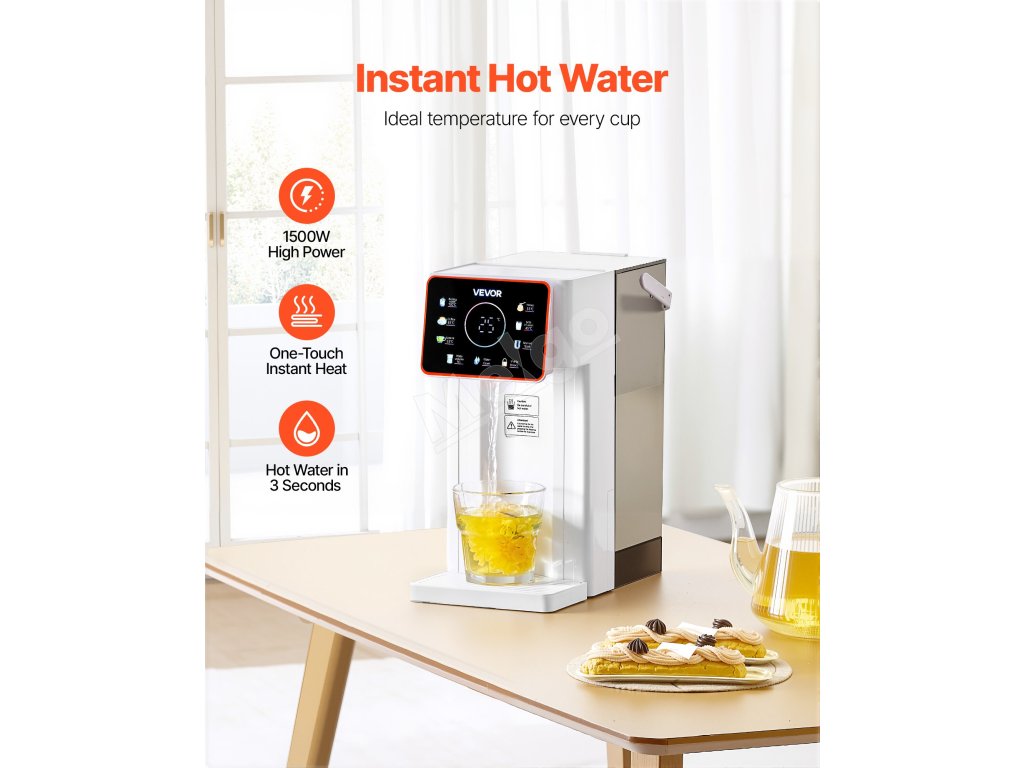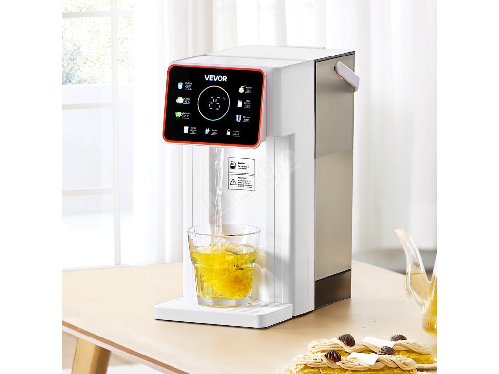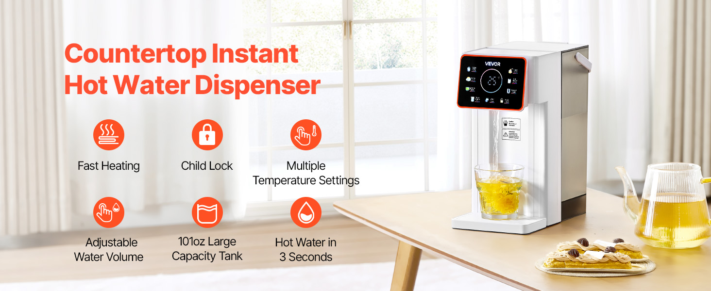 Tento pultový dávkovač horúcej vody využíva inovatívnu technológiu rýchleho ohrevu na presnú reguláciu teploty vody od 25 °C do 100 °C a dodáva horúcu vodu už za 3 sekundy. Vďaka veľkej nádržke na vodu s objemom 101 uncí (3 l) je ideálny na domáce a kancelárske použitie.