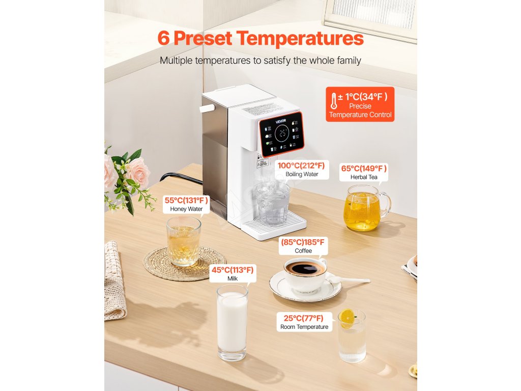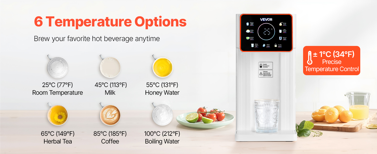 Tento rýchlovýdajník horúcej vody ponúka 6 prednastavených možností teploty (25 °C, 45 °C, 55 °C, 65 °C, 85 °C, 100 °C) s presnou reguláciou teploty v rozmedzí ±1 °C, čo zaručuje ideálne teploty na prípravu rôznych horúcich nápojov.