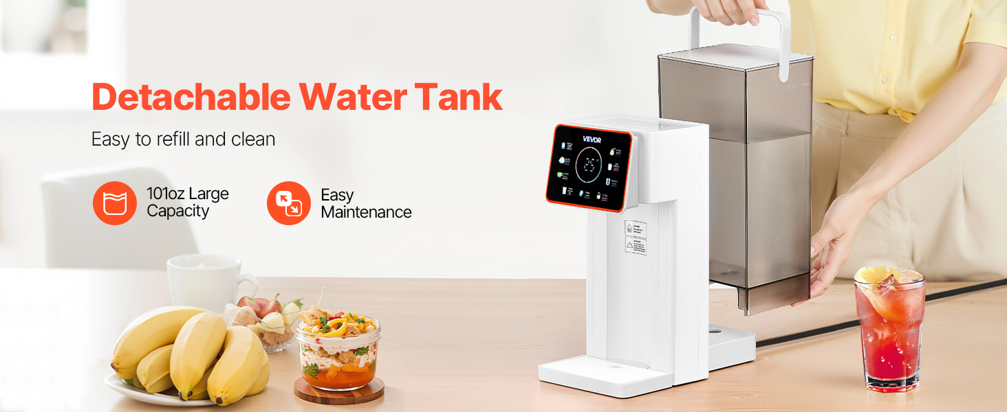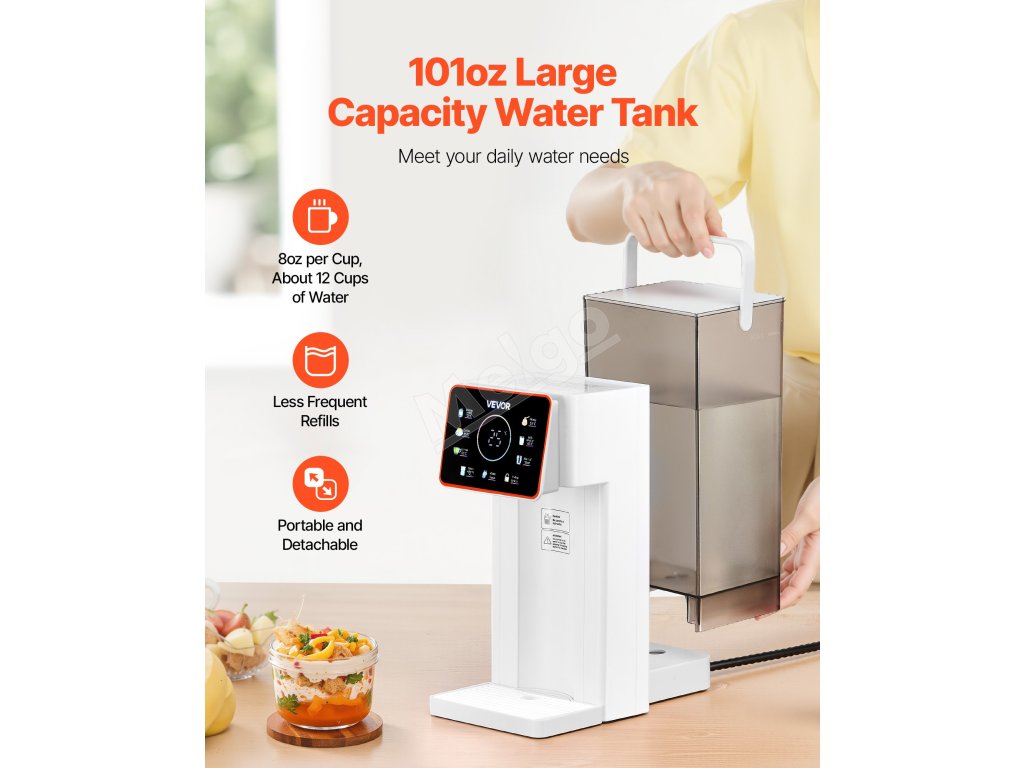 Tento elektrický dávkovač teplej vody, vybavený odnímateľnou nádržkou na vodu s objemom 101 oz (3 l), sa ľahko plní a čistí, čím ponúka pohodlie a praktickosť pri každodennom používaní.
