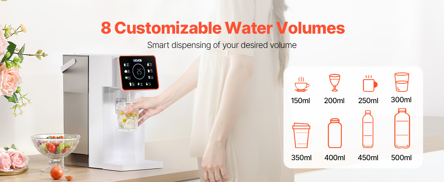 Stolný výdajník vody s 8 úrovňami objemu vody ponúka inteligentné ovládanie s presným dávkovaním vody. Nie je potrebné čakať a prietok vody môžete manuálne zastaviť podľa svojich potrieb, čo je pohodlné a efektívne.