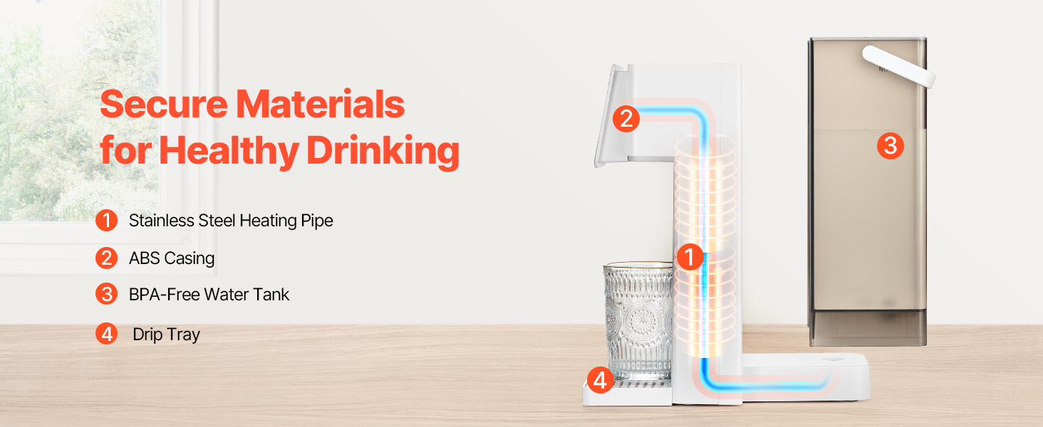 Ohrievací systém je vyrobený z potravinárskej nehrdzavejúcej ocele, zatiaľ čo nádržka na vodu je vyrobená z materiálu ASB bez obsahu BPA, čo zaručuje čistú a bezpečnú pitnú vodu pre vás a vašu rodinu.