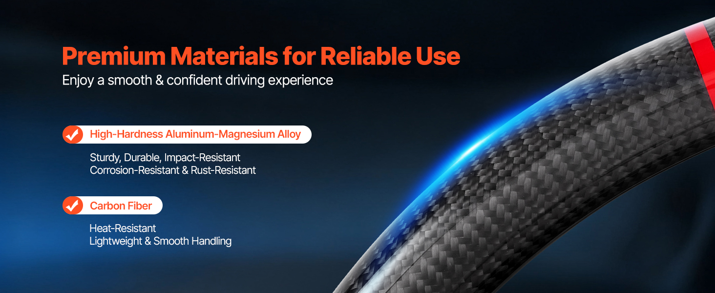 Náš volant z uhlíkových vlákien je vyrobený z vysoko tvrdej zliatiny hliníka a horčíka, ktorá je pevná, odolná, nárazuvzdorná a odolná voči korózii. Materiál z uhlíkových vlákien je odolný voči vysokým teplotám a ľahký, čím zlepšuje jazdné vlastnosti a zvyšuje spoľahlivosť jazdy.