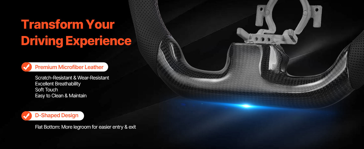 Premeňte svoj zážitok z jazdy. Tento volant z pravého karbónu je vybavený priedušnou kožou z mikrovlákna, ktorá poskytuje jemný dotyk, odolnosť proti opotrebovaniu a poškriabaniu a ľahko sa čistí a udržiava. Jeho dizajn v tvare písmena D zväčšuje priestor pre nohy, vďaka čomu je nastupovanie a vystupovanie z vozidla pohodlné.