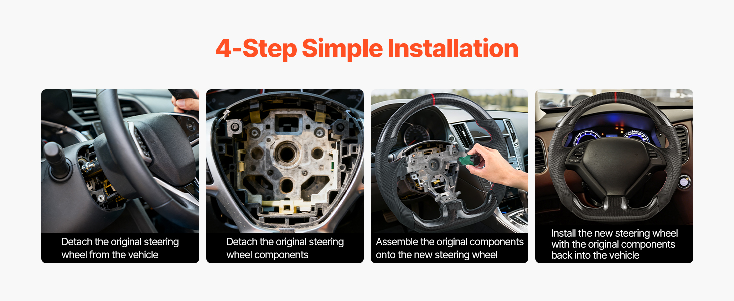 Tento volant s plochým spodkom nainštalujete v štyroch jednoduchých krokoch: 1) odpojte sériový volant; 2) odpojte diely OEM; 3) namontujte diely OEM na nový volant; 4) namontujte nový volant. Nie sú potrebné žiadne špeciálne zručnosti - aktualizácia za niekoľko minút.