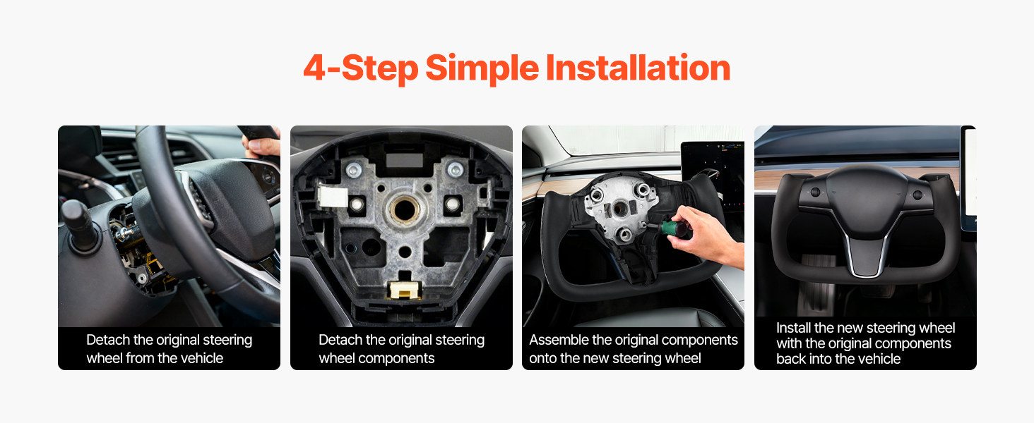 Tento volant s plochou spodnou časťou nainštalujete v štyroch jednoduchých krokoch: 1) odpojte sériový volant; 2) odpojte diely OEM; 3) namontujte diely OEM na nový volant; 4) namontujte nový volant. Nie sú potrebné žiadne špeciálne zručnosti - aktualizácia za niekoľko minút.