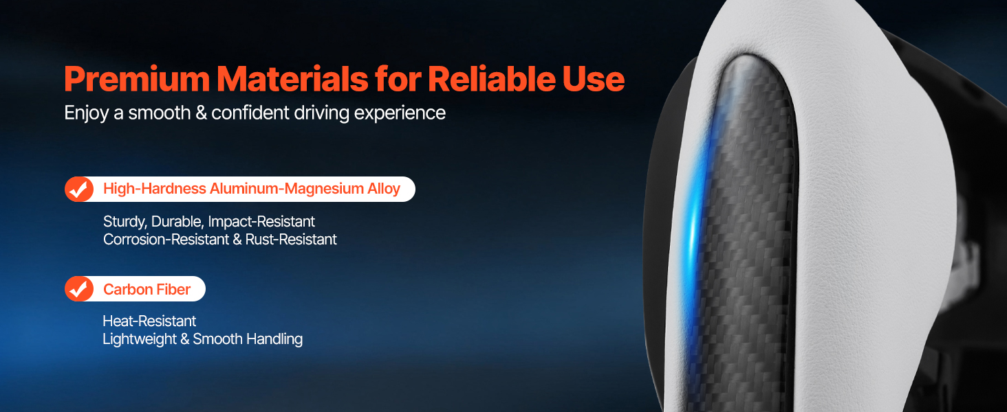 Náš volant z uhlíkových vlákien je vyrobený z vysoko tvrdej zliatiny hliníka a horčíka, ktorá je pevná, odolná, nárazuvzdorná a odolná voči korózii. Materiál z uhlíkových vlákien je odolný voči vysokým teplotám a ľahký, čím zlepšuje jazdné vlastnosti a zvyšuje spoľahlivosť jazdy.