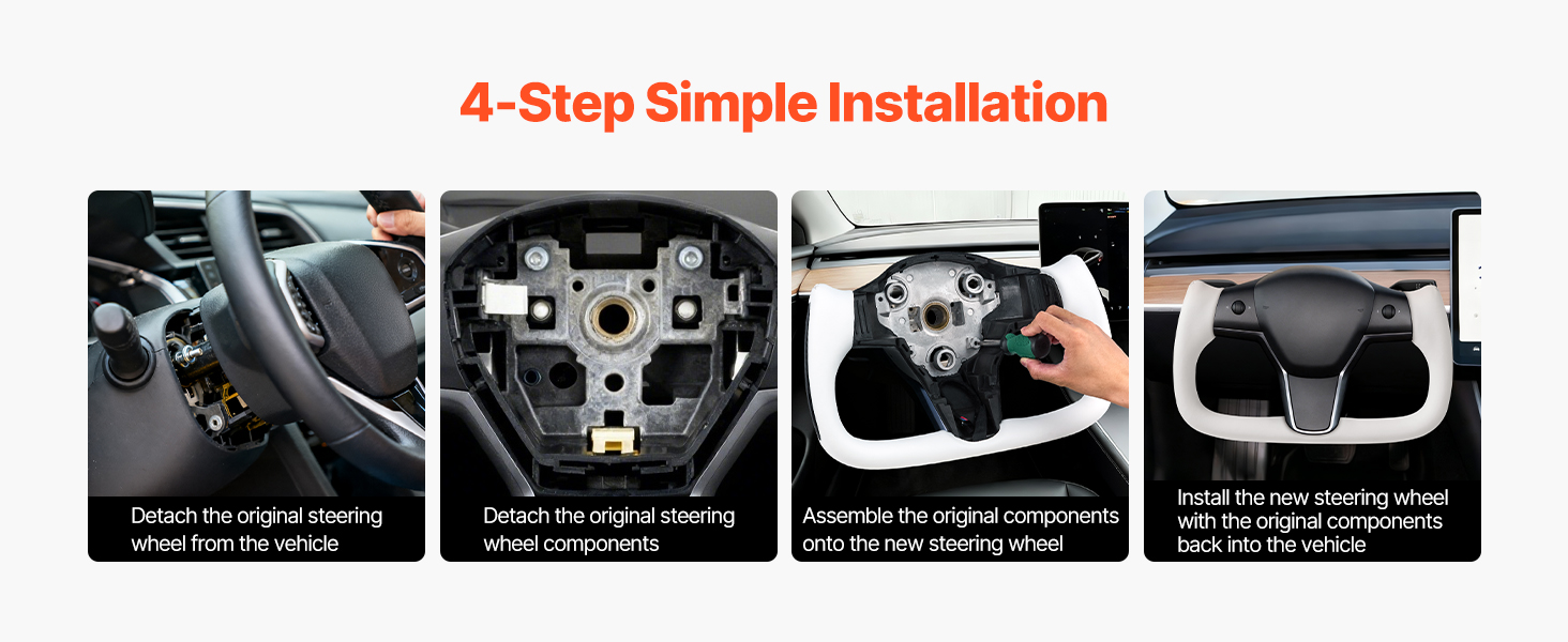 Tento volant s plochou spodnou časťou nainštalujete v štyroch jednoduchých krokoch: 1) odpojte sériový volant; 2) odpojte diely OEM; 3) namontujte diely OEM na nový volant; 4) namontujte nový volant. Nie sú potrebné žiadne špeciálne zručnosti - aktualizácia za niekoľko minút.