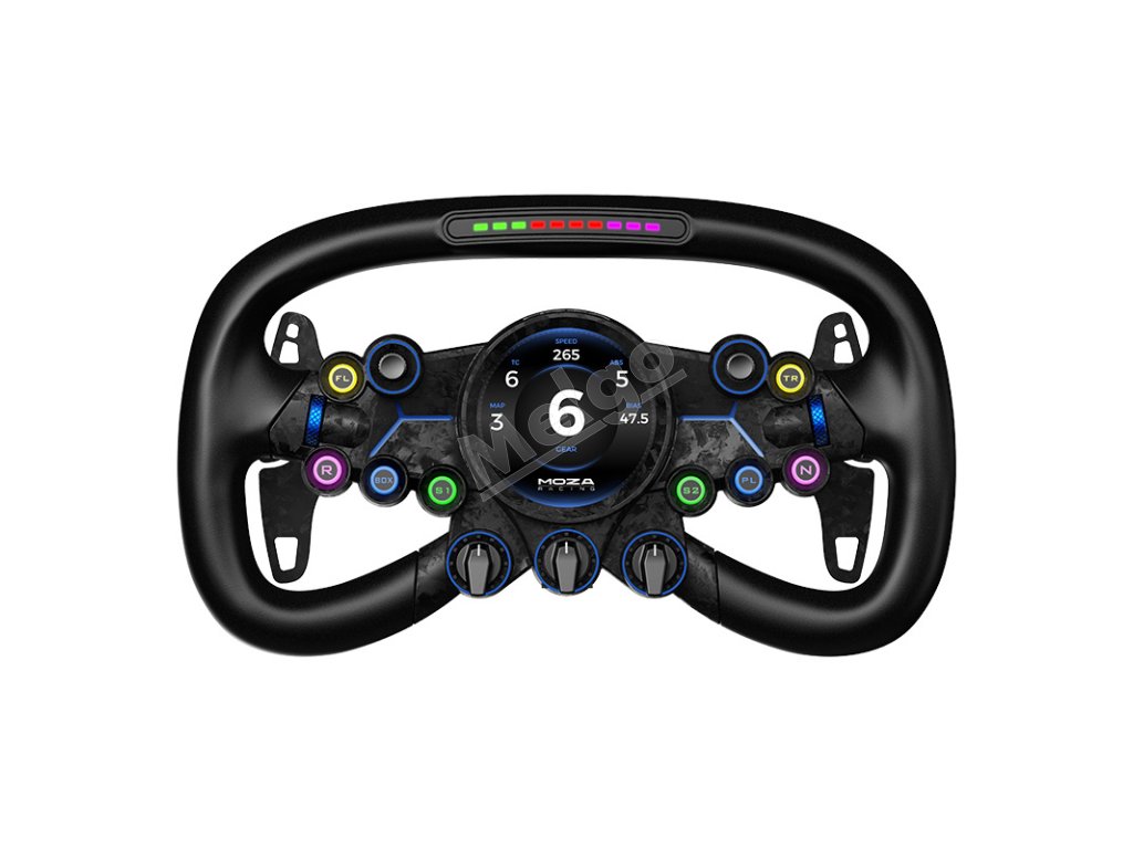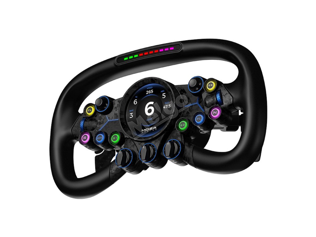 Predný panel obsahuje 8 podsvietených tlačidiel RGB s ultrakrátkou roztečou (0,25 mm), ktoré reagujú o 60 % rýchlejšie ako tradičné tlačidlá. Okrem toho sa na zadnej strane nachádzajú dve prispôsobiteľné tlačidlá - ideálne na aktiváciu DRS, KERS alebo zmenu mapy motora. Volant je vybavený aj indikátorom maximálnej rýchlosti (otáčok) s desiatimi vysoko jasnými LED diódami s možnosťou výberu zo 16,7 milióna farieb. Systém môže fungovať aj ako indikátor vlajky, čo je mimoriadne dôležité pri online pretekoch - to všetko preto, aby ste boli vždy o krok pred konkurenciou.
