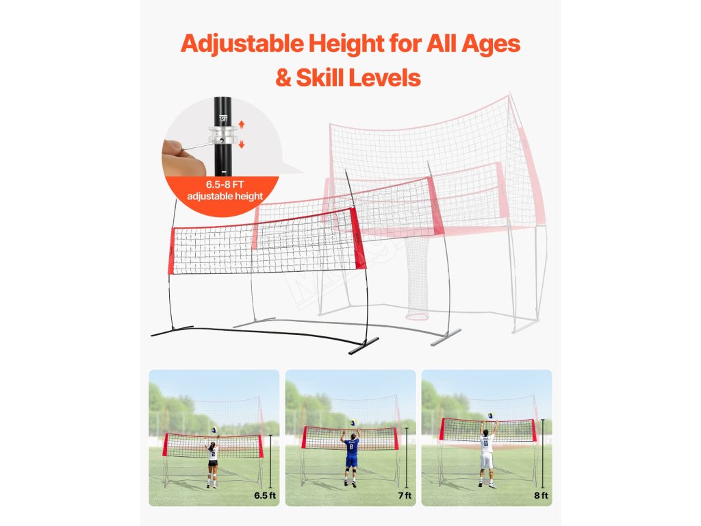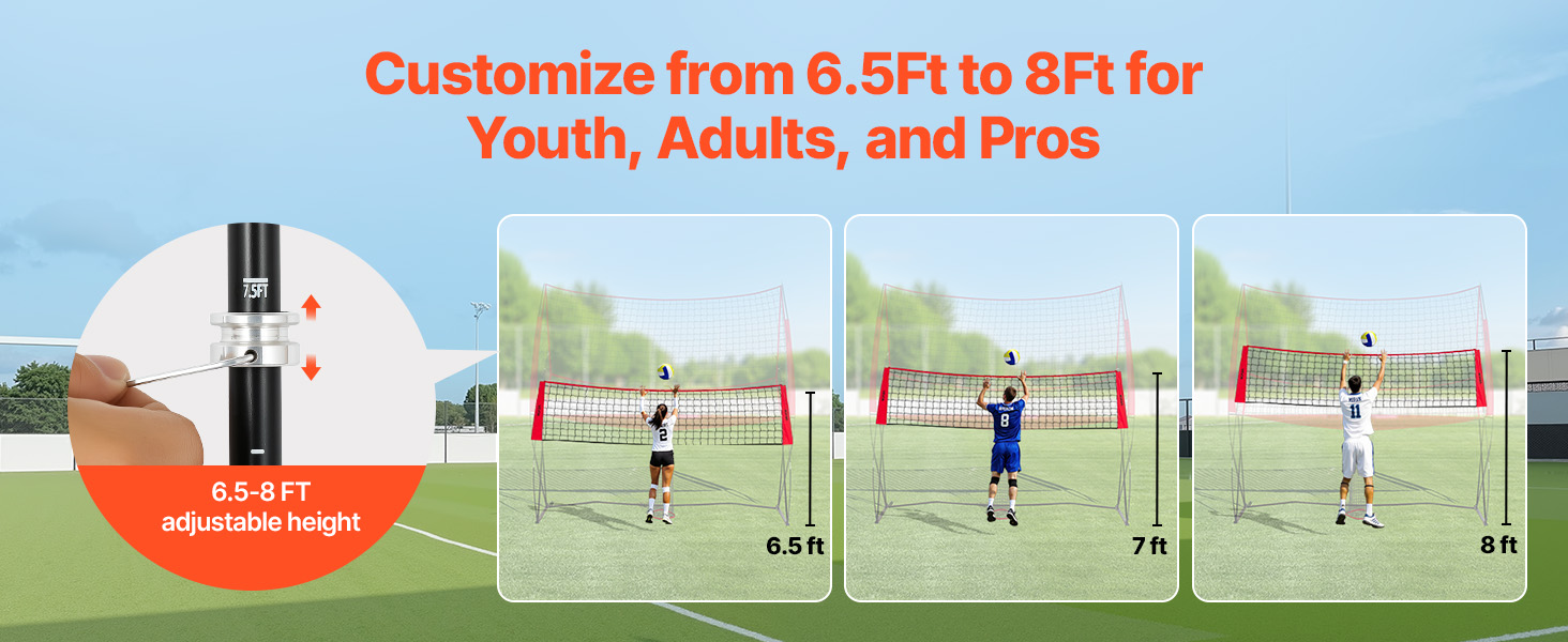 Náš oceľový rám sa plynulo nastavuje od 6,5 stopy (začiatočníci/mládež) do 8 stôp (profesionálna regulárna výška) , čo vám umožňuje simulovať herné scenáre pre podania, bodnutia a bloky.