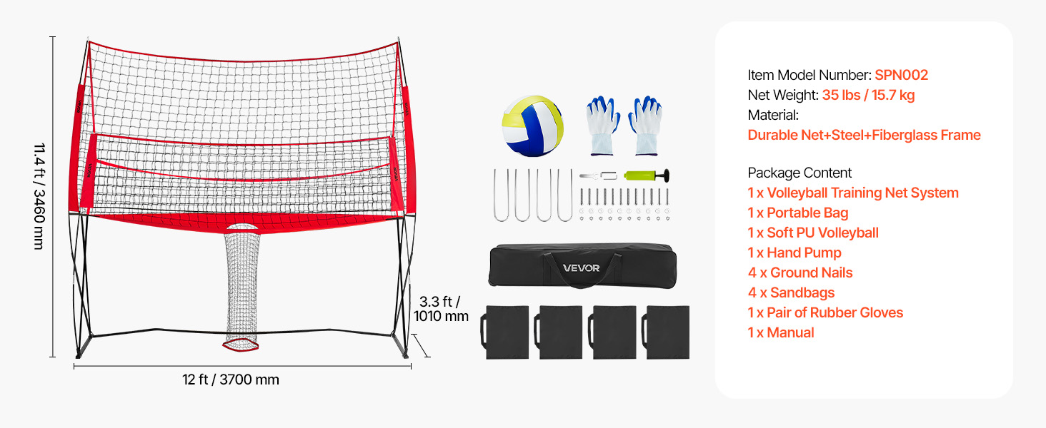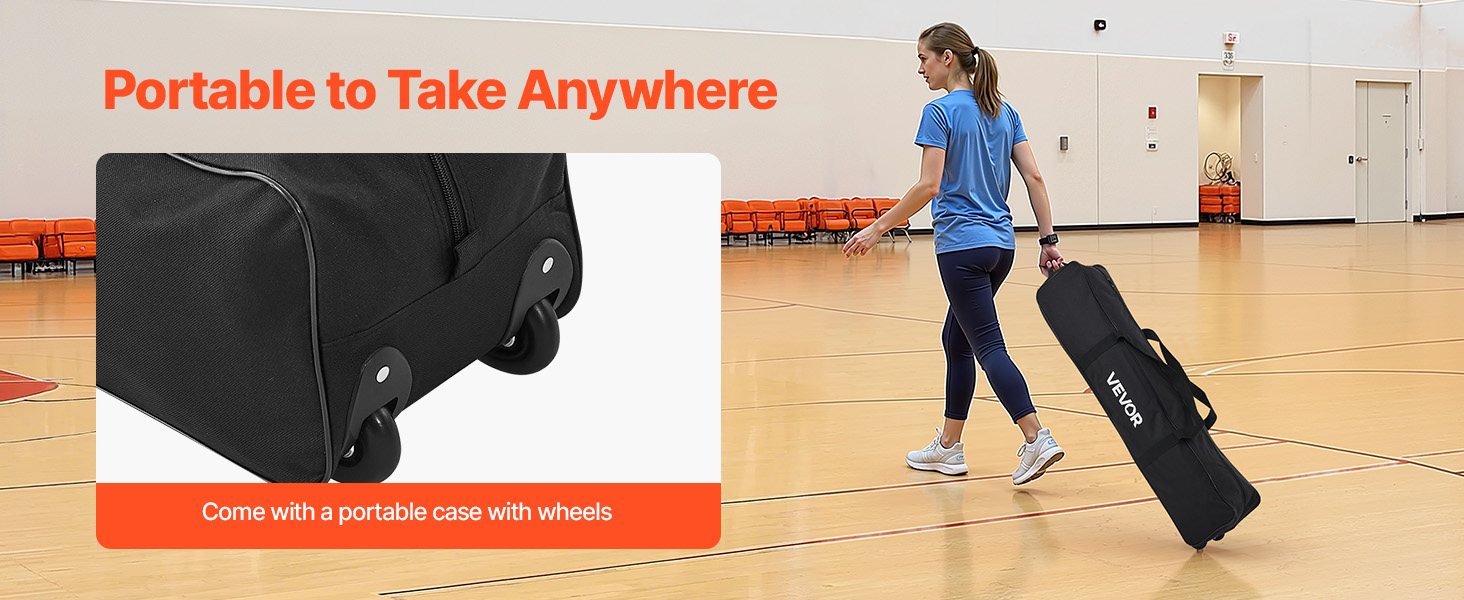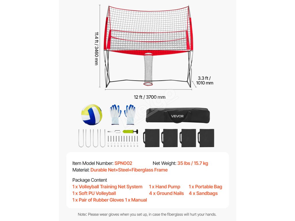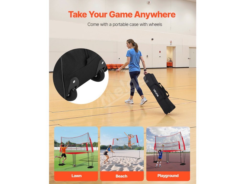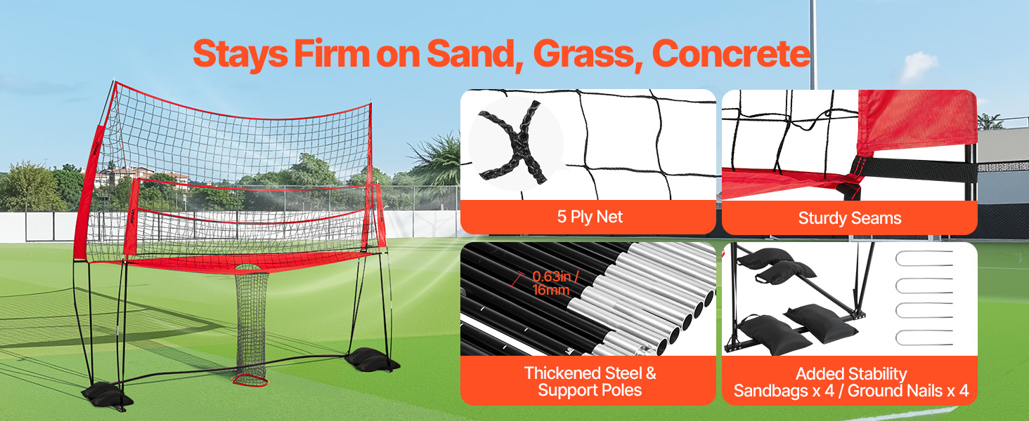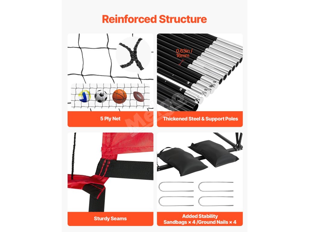 Zhrubnutý oceľový rám odoláva korózii, zosilnená sieť odoláva opotrebovaniu. Toto volejbalové tréningové vybavenie sa dodáva so 4 silnými vrecami s pieskom pre pevnú stabilitu v piesku alebo vo vetre.