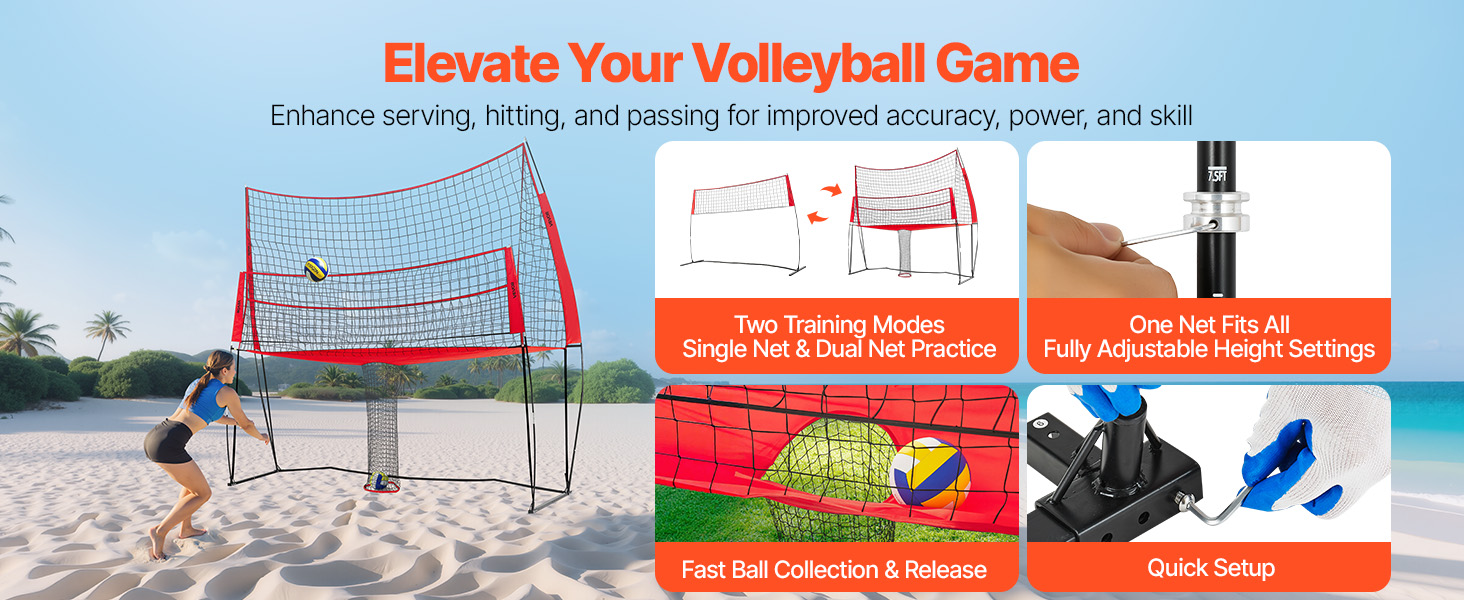 Tréningová volejbalová sieť 2 v 1, nastaviteľná výška, návrat lopty