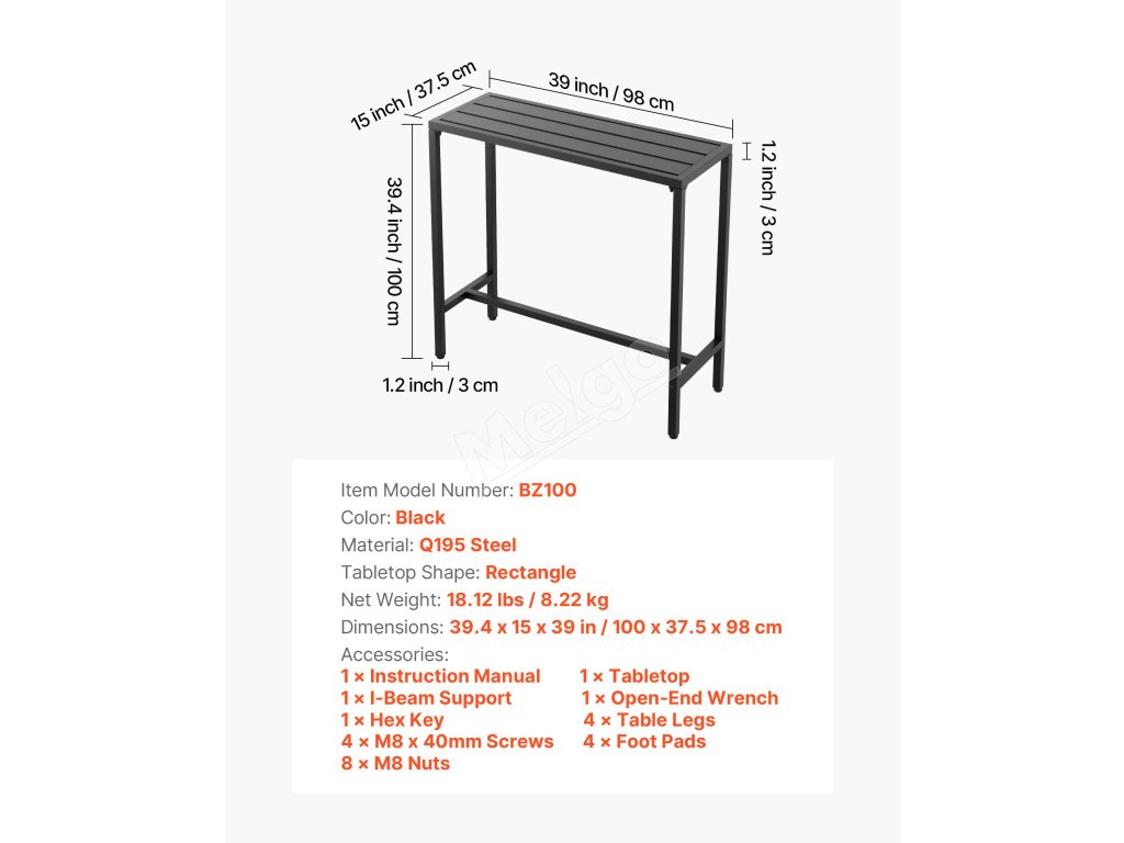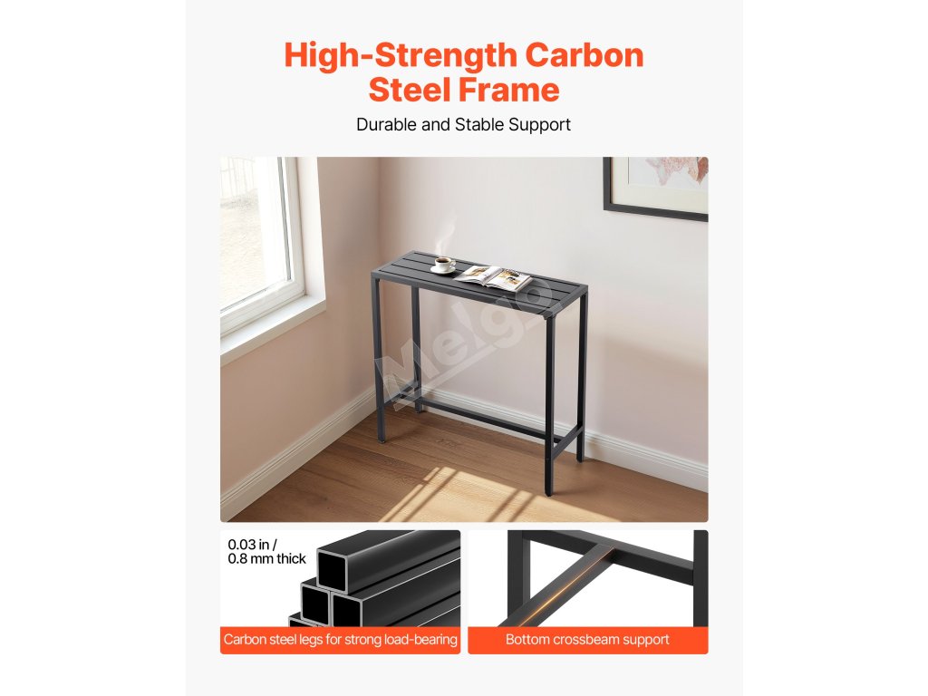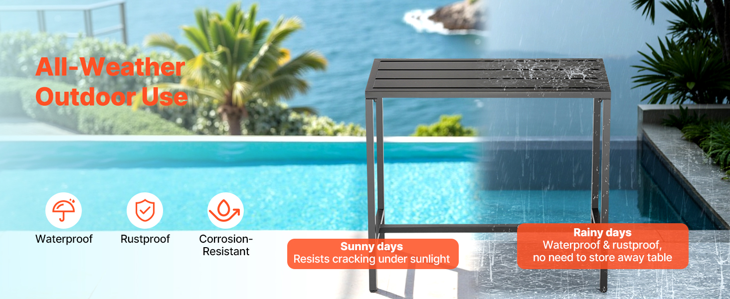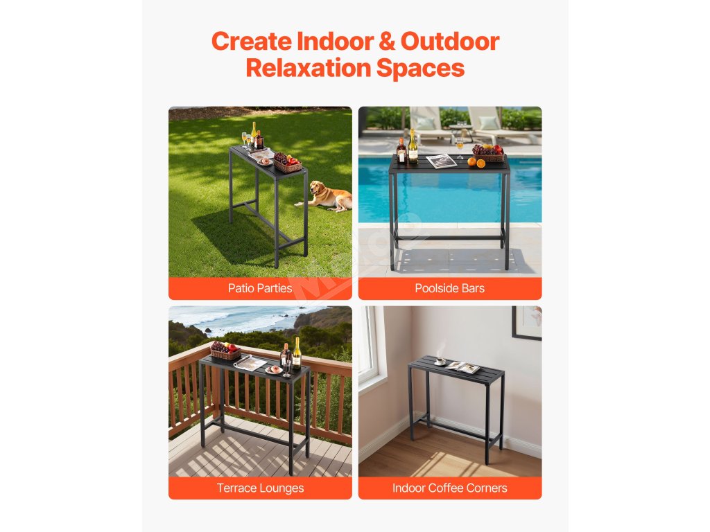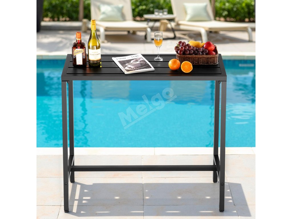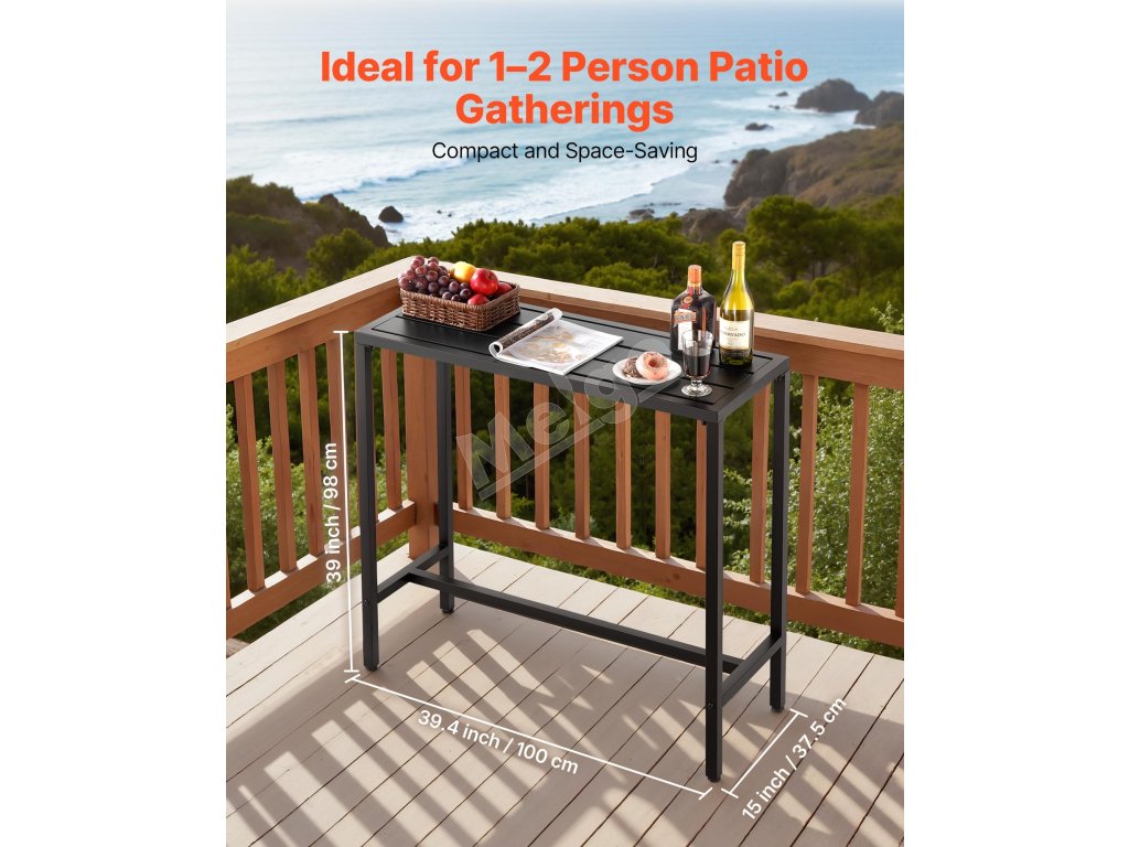 Náš barový stôl na terasu s rozmermi 39,4 x 15 palcov má robustný kovový rám a hrubú, vodeodolnú stolovú dosku, ktorá odoláva ohýbaniu a deformácii. Je ideálny na stretnutia pri bazéne, vonkajšie záhradné párty alebo vnútorné jedálne, je ideálny na intímne stretnutia alebo osobné chvíle oddychu.