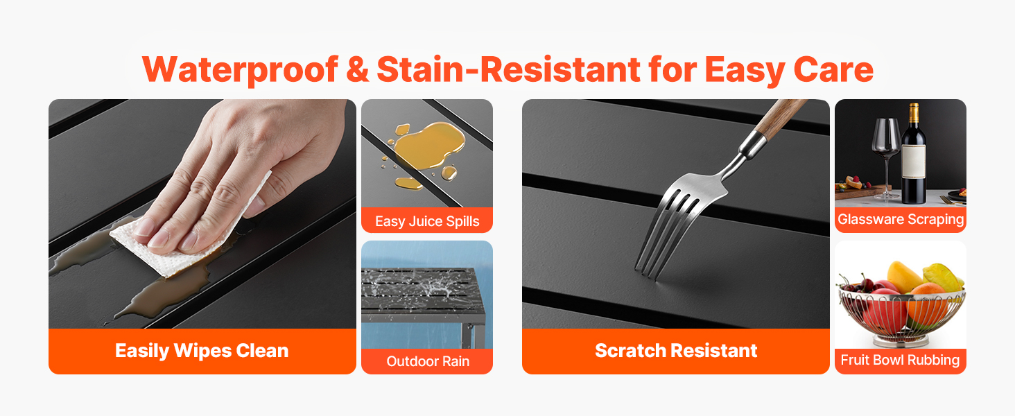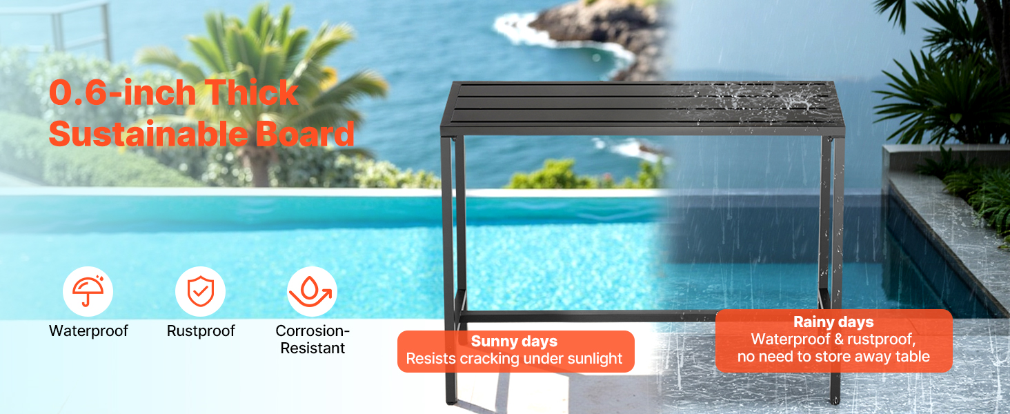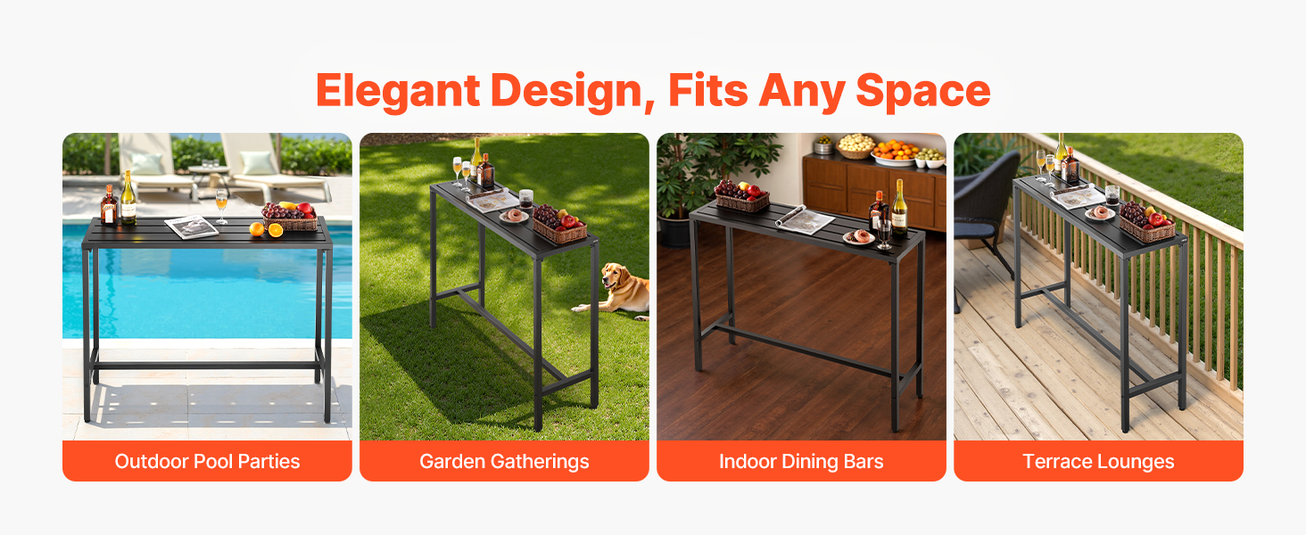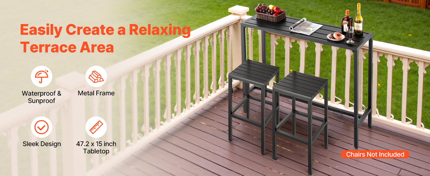 Náš barový stôl na terasu s rozmermi 47 x 15 palcov má robustný kovový rám a hrubú, vodeodolnú stolovú dosku, ktorá odoláva ohýbaniu a deformácii. Je ideálny na stretnutia pri bazéne, vonkajšie záhradné párty alebo vnútorné jedálne, je ideálny na intímne stretnutia alebo osobné chvíle oddychu.