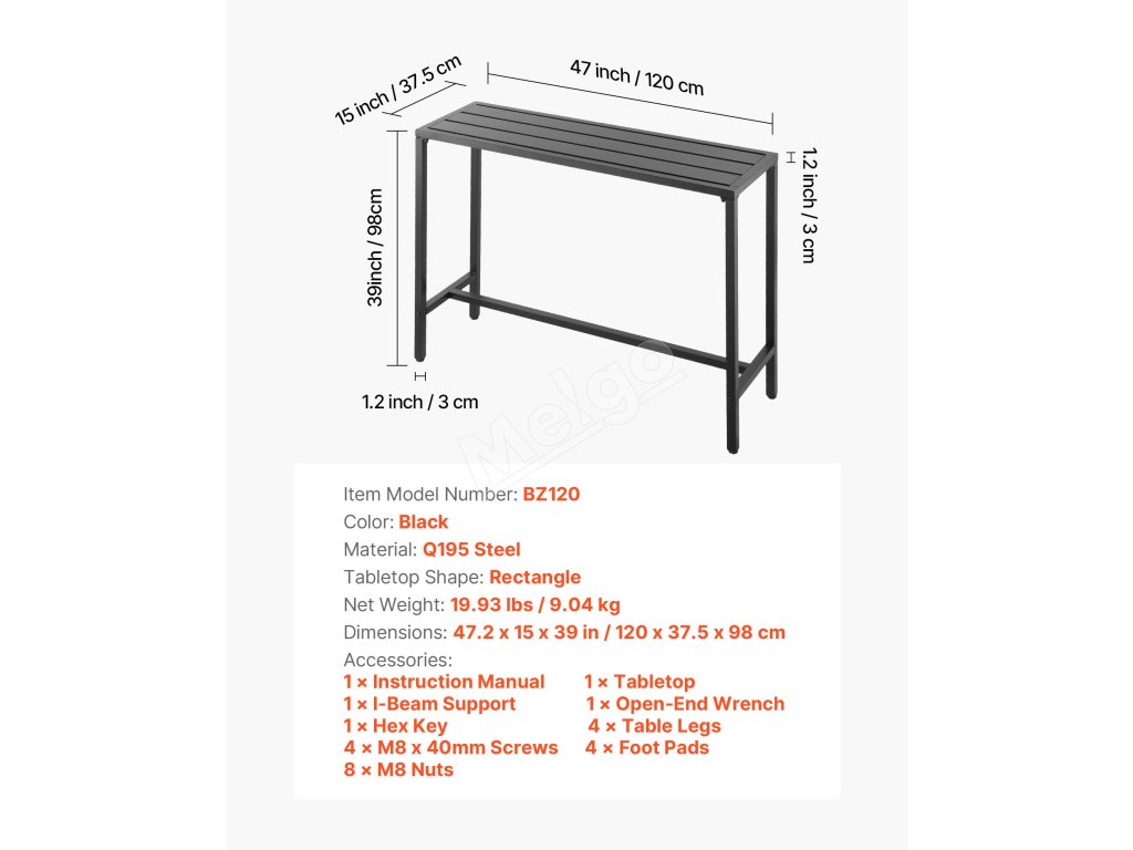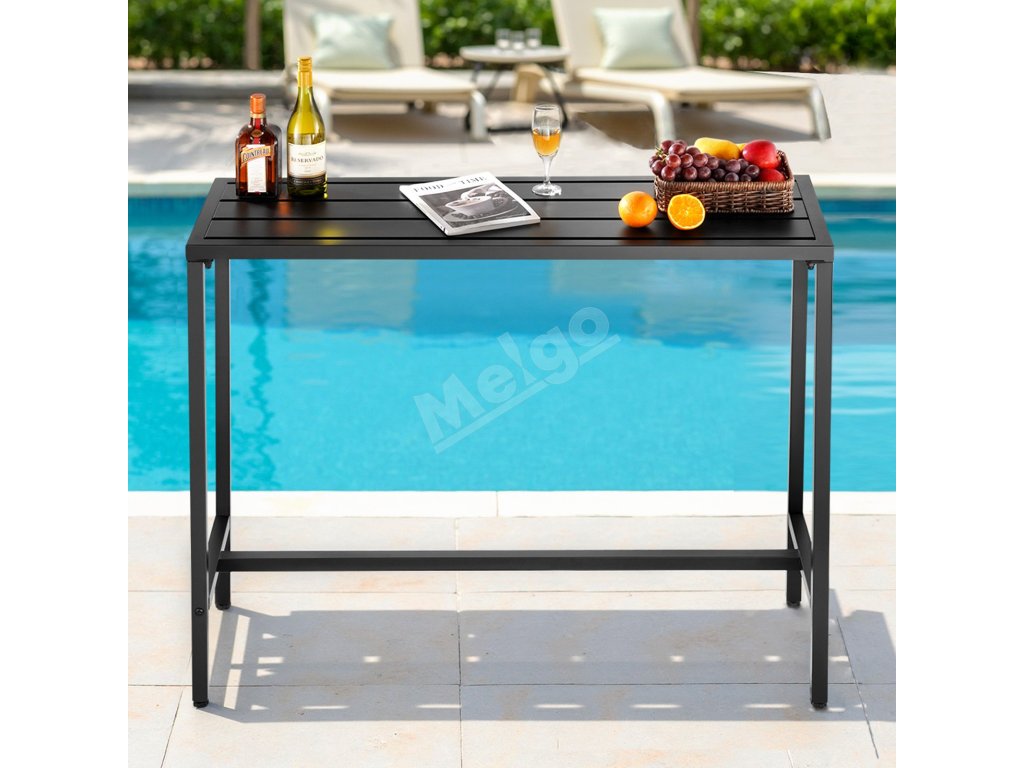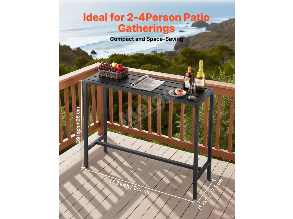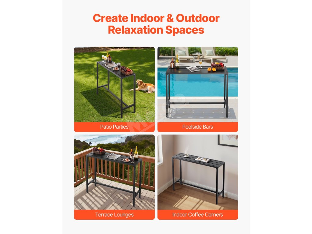 Náš barový stôl na terasu s rozmermi 47 x 15 palcov má robustný kovový rám a hrubú, vodeodolnú stolovú dosku, ktorá odoláva ohýbaniu a deformácii. Je ideálny na stretnutia pri bazéne, vonkajšie záhradné párty alebo vnútorné jedálne, je ideálny na intímne stretnutia alebo osobné chvíle oddychu.