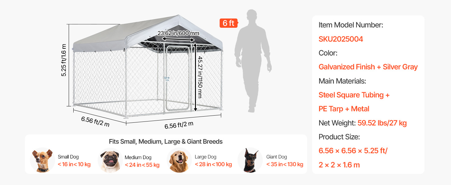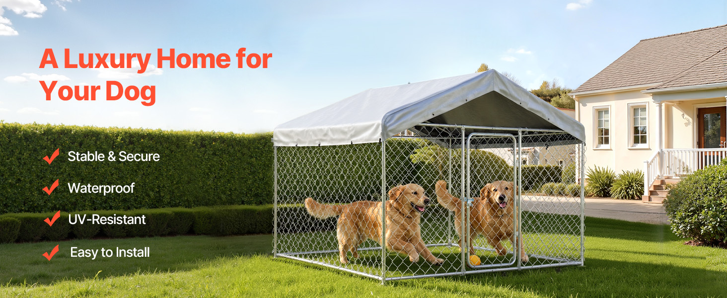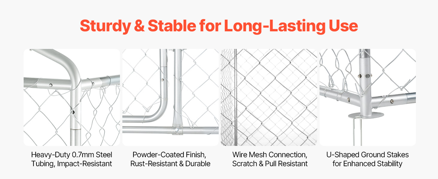 Veľká psia búda je vyrobená z odolných oceľových rúrok a zváraných drôtených panelov s antikoróznym povlakom, vďaka čomu odoláva ohybu, opotrebeniu a korózii. Je navrhnutá pre dlhodobé vonkajšie použitie.
