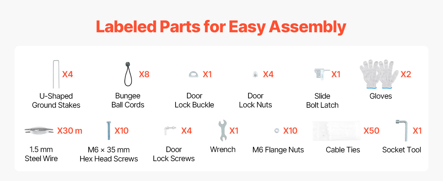 Vonkajšia psia búda je dodávaná s kompletným príslušenstvom a ochrannými rukavicami. Označené diely a samostatné balenie uľahčujú montáž a šetria čas.